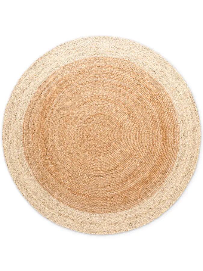 Kulatý koberec Jutta z ručně tkané přírodní juty v teplé kombinaci slonovinové a zlaté je jedinečný přírodní doplněk do interiéru i na krytou terasu.