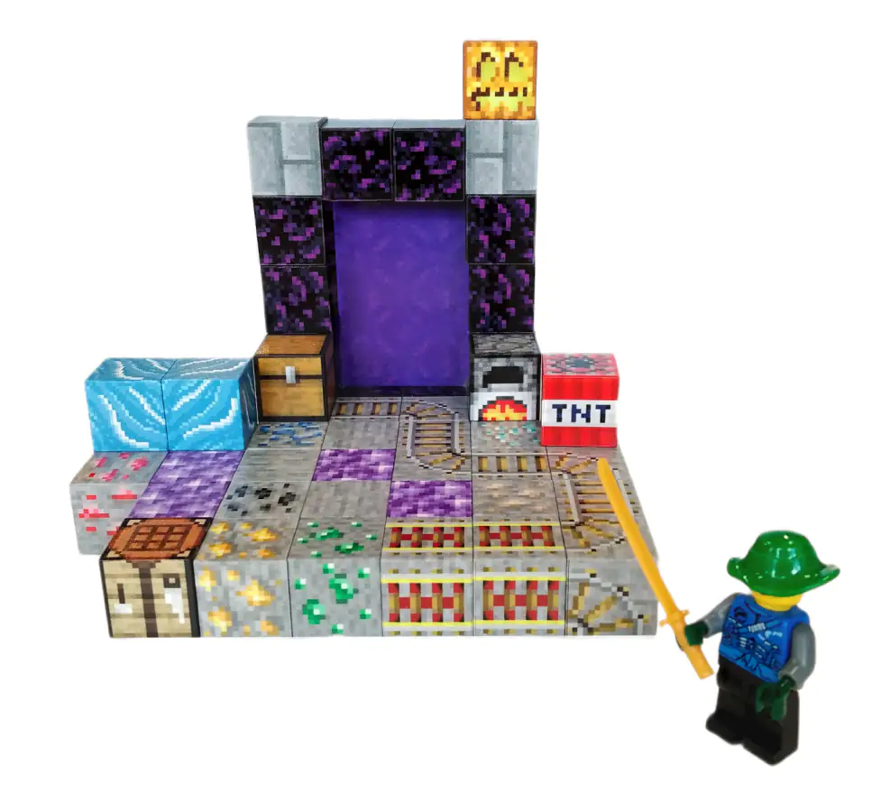 Sada obsahuje 50 dílků, které lze díky magnetům snadno spojovat a rozpojovat. Děti si mohou postavit netherový portál, prostředí s rudami, TNT výbušninou a dalšími herními prvky. Nechybí figurka s plastovým mečem, připravená na boj a průzkum.