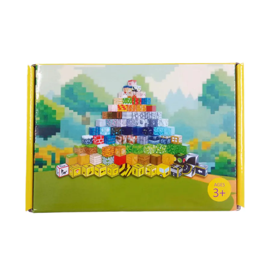 Kostky jsou potištěny detailními texturami, které věrně napodobují prostředí ze hry Minecraft. Obsahují motivy jako železniční koleje, pracovní stůl, pec, ruda, obsidián a dýně se strašidelným obličejem. Kvalitní potisk a odolný plast zajišťují dlouhou životnost a bezpečné hraní pro děti od 3 let.