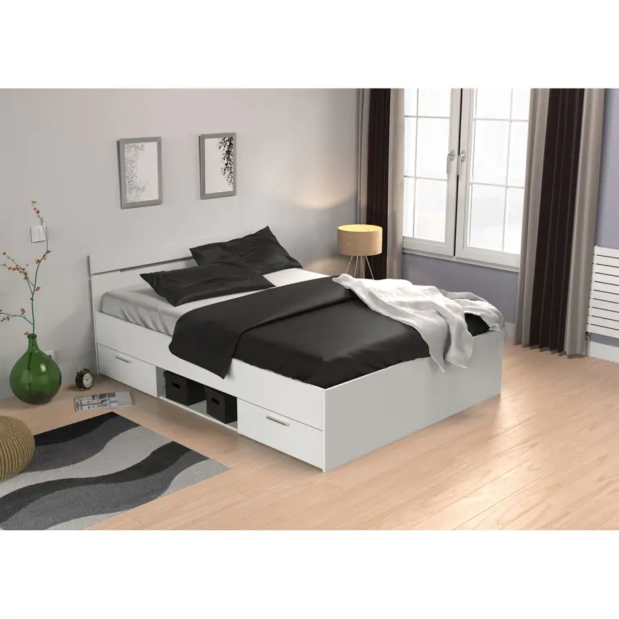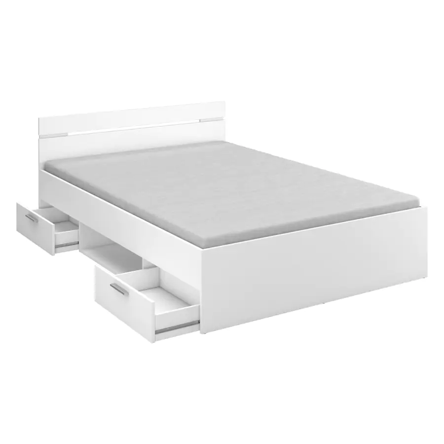 Postel je vyrobena z laminované dřevotřísky v barevném provedení perleťově bílá. Součástí postele jsou 2 úložné zásuvky s kovovými pojezdy, rozměr zásuvky (š/v/h) 56 × 11 × 33 cm. Rozměr niky...