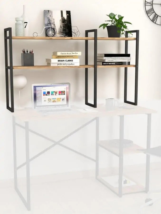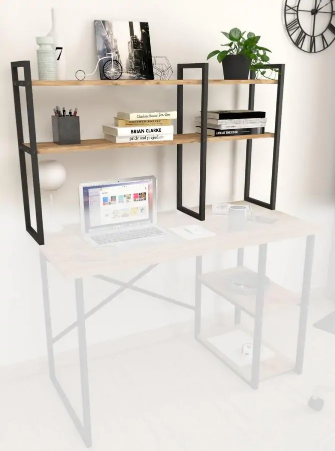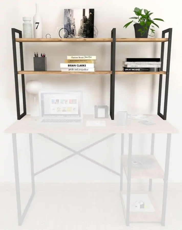 Regál MARSON, který lze umístit i na pracovní stůl je z kovového rámu v matné černé barvě, police jsou z kvalitní LTD desky v barvě borovice.