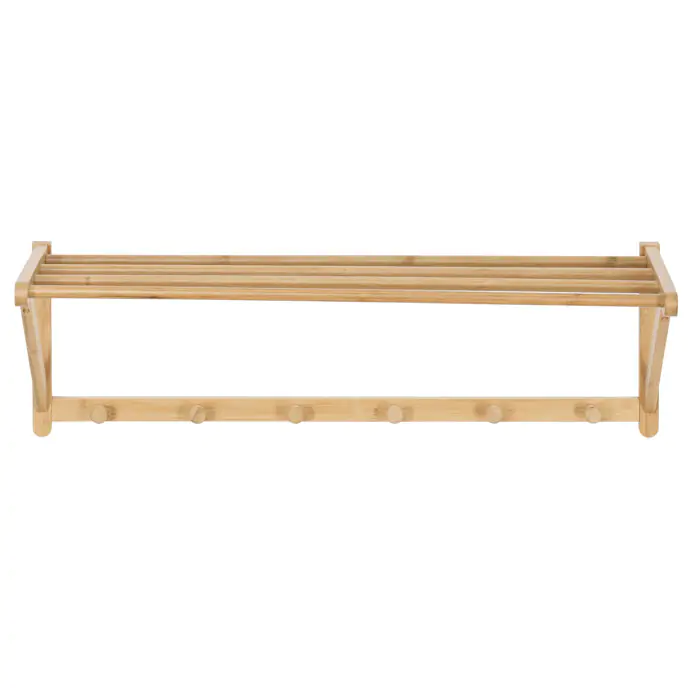 Nástěnná police DR-B004 NAT s věšáky je vyrobena z masivního bambusu v přírodním odstínu, který přináší do interiéru příjemnou a teplou atmosféru.