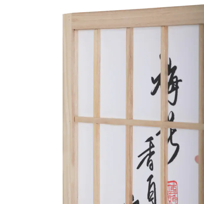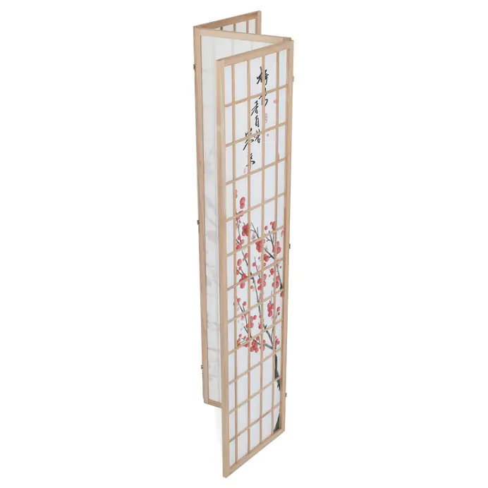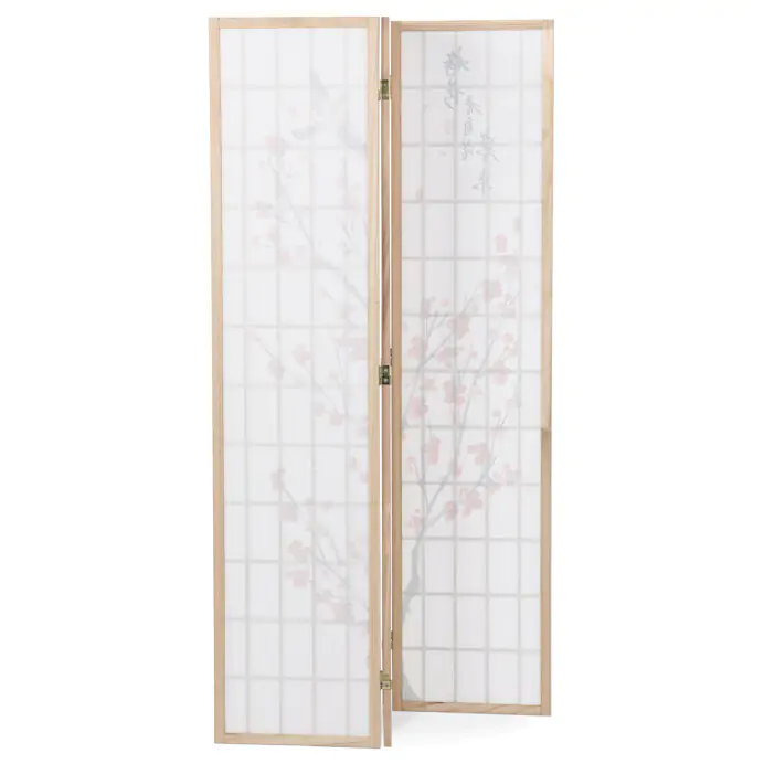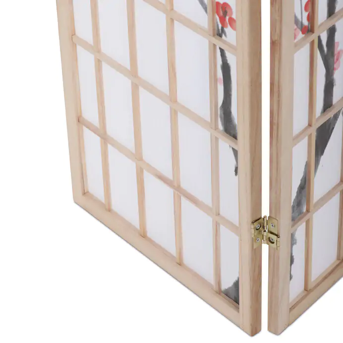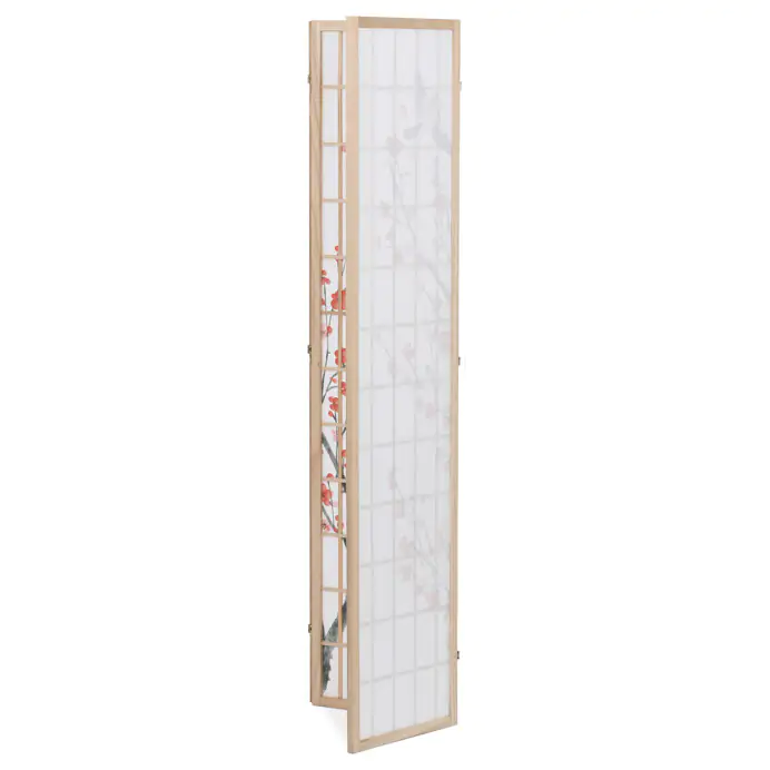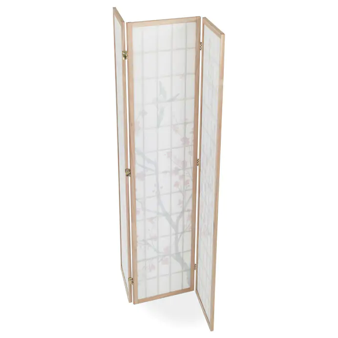 Třípanelový paraván EF-L185 NAT z masivního smrkového dřeva v přírodním odstínu nabízí lehkou a vzdušnou přepážku s bílou netkanou textilií, která je zdobená jemným motivem větví s květy a ptáky v černých a červených tónech.