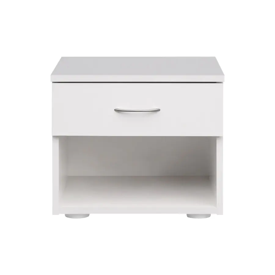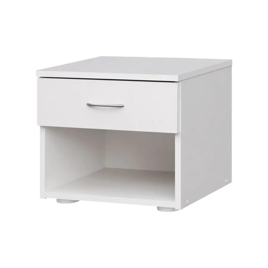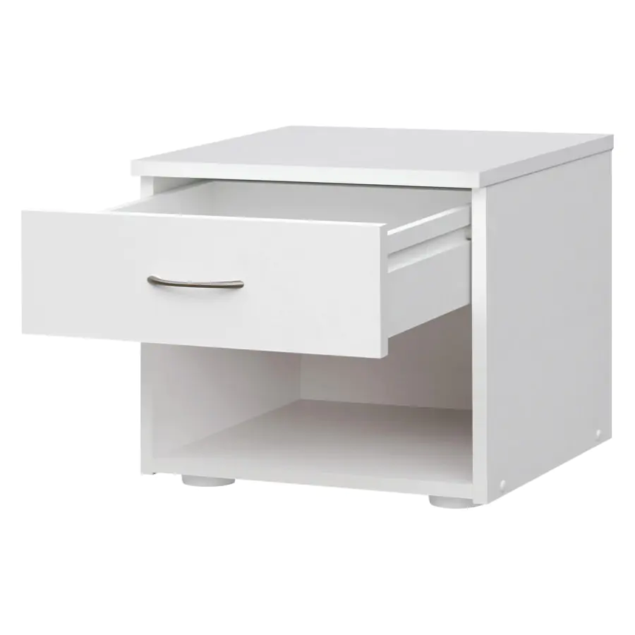 Noční stolek s jednou zásuvkou je vyroben z laminované dřevotřísky v bílé barvě.