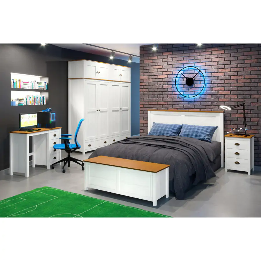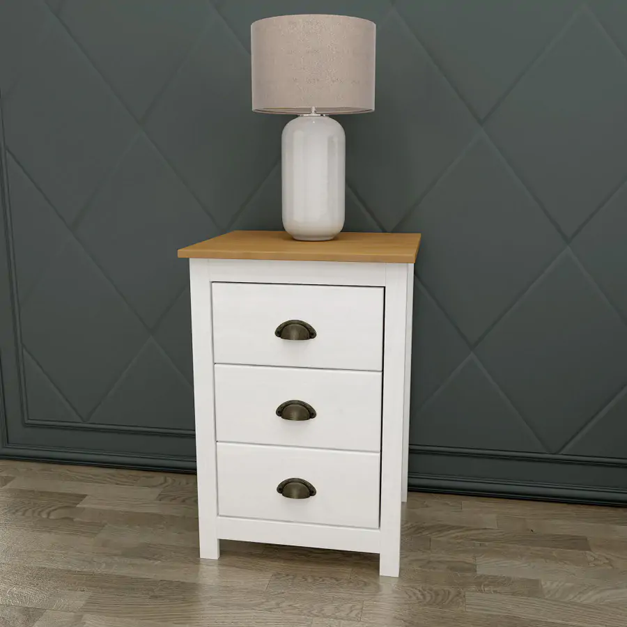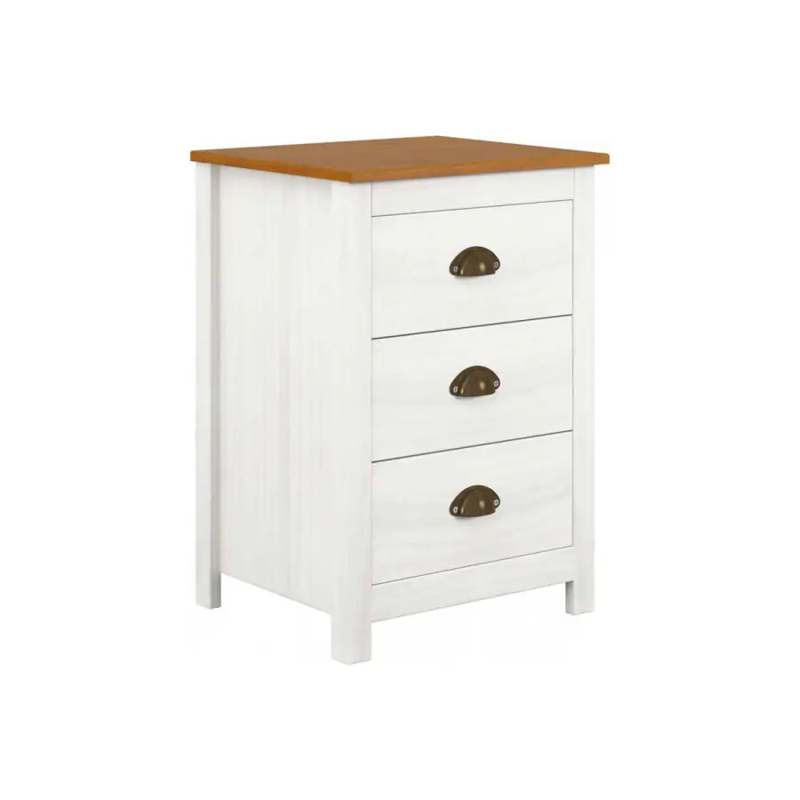 Bílý masivní noční stolek má hnědou vrchní desku.
