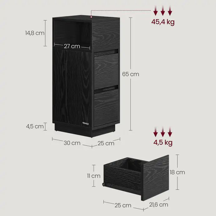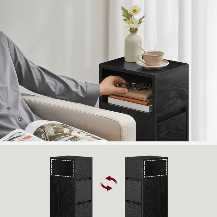 Stabilní základna zajišťuje bezpečné postavení a odolnost při každodenním používání. Tento stolek je vhodný pro uložení knih, drobných předmětů i nočních potřeb.