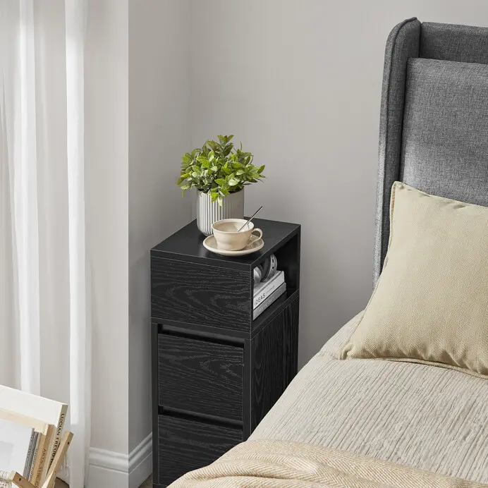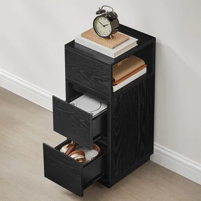 Noční stolek ANT-E1065 BK v černém provedení kombinuje pevnou MDF desku s praktickým úložným prostorem, který zahrnuje otevřenou přihrádku a dvě zásuvky.