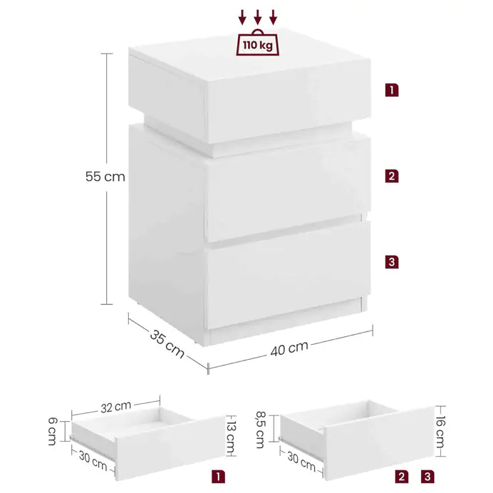Díky jednoduchému designu a bílé barvě je stolek univerzálním doplňkem ložnice s důrazem na funkčnost.