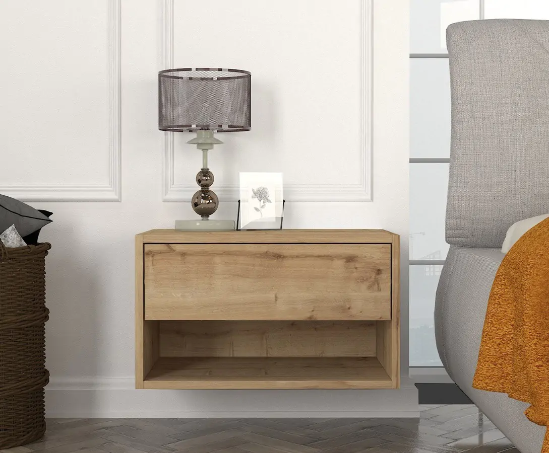 Závěsný noční stolek VIKTORIE se zásuvkou je kvalitního lamina o tl.18 mm hraněné PVC páskou, odolného proti poškrábání v barvě sapphire. Dodáváme v demontovaném stavu.