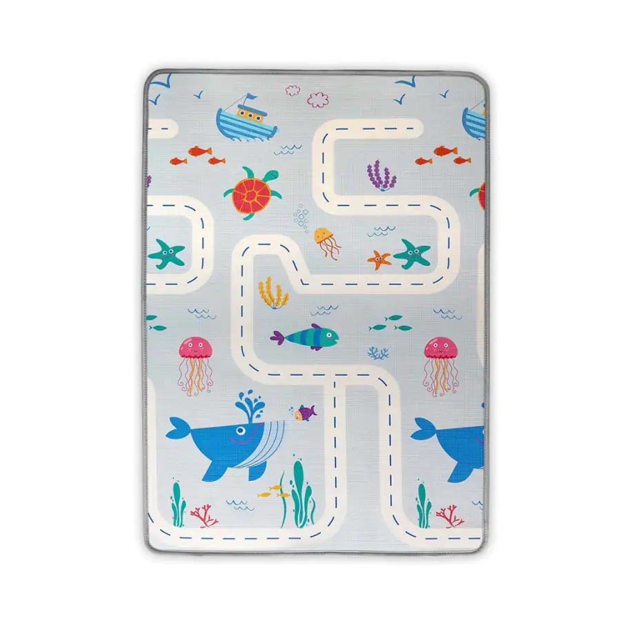 Oboustranná pěnová podložka Kinder Sea and Africa s veselými zvířátky na jedné a podmořským světem na druhé straně, nabídne i těm nejmenším prostor pro první lezení, hraní, i nesmělé krůčky a stane se tak nedílnou součástí každého dětského pokojíčku, či herničky.
