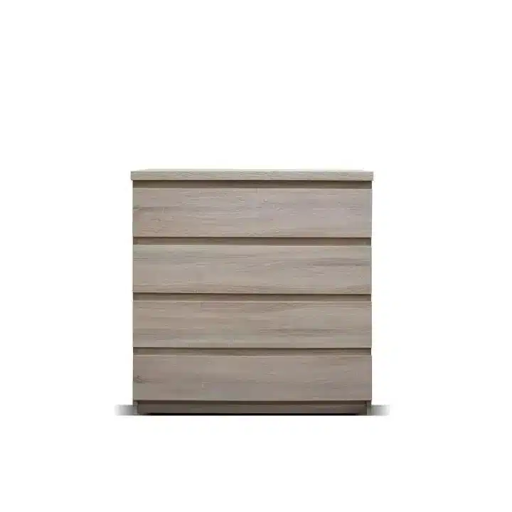 Komoda obsahuje čtyři zásuvky a je vyrobena z laminované dřevotřísky s ABS hranami v dekoru dub sonoma.