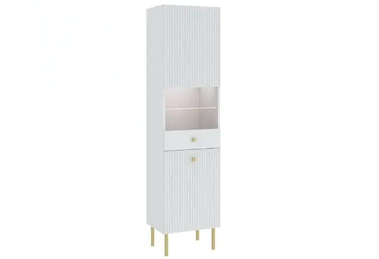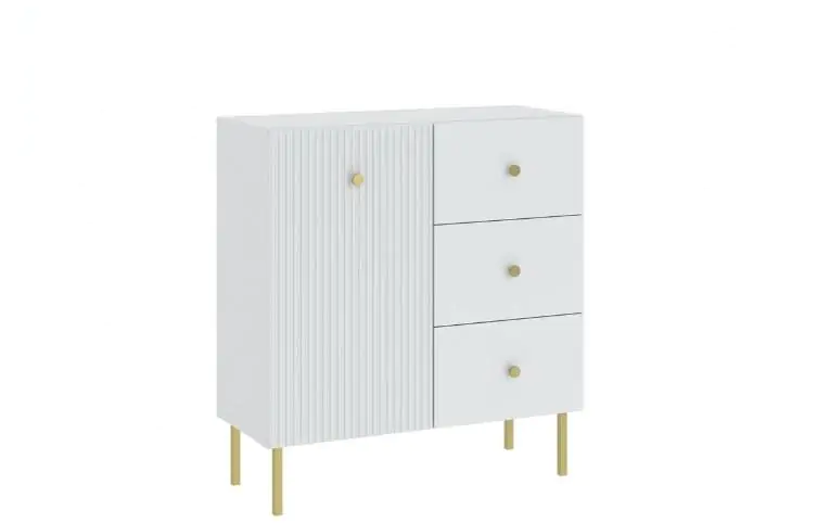 Elegantní a nadčasová, vhodná do moderního obývacího pokoje? To je obývací sestava ALMONTE v bílé barvě, kterou doplňují zlaté kovové detaily v podobě úchytek a nožek. Přední části jednotlivých kousků nábytku zdobí frézování.