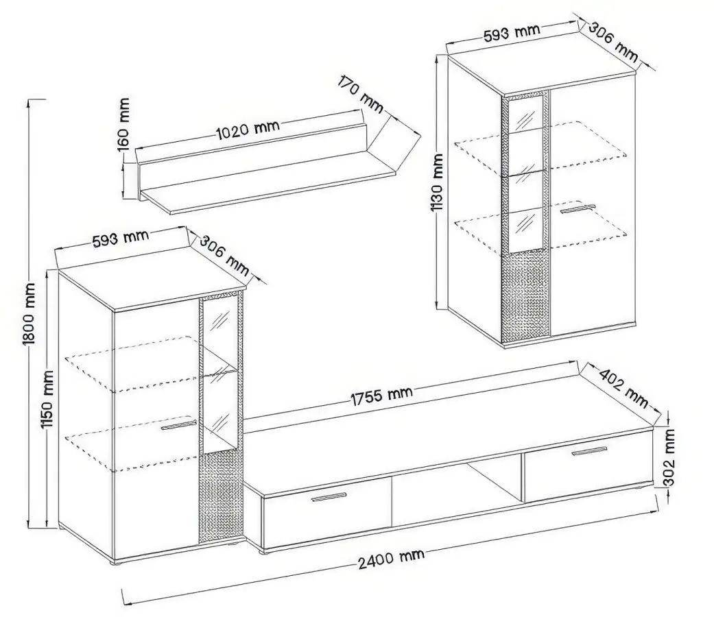 Obývací stěna sestává z TV stolku, závěsné police, stojící a závěsné vitríny s čirým sklem.
