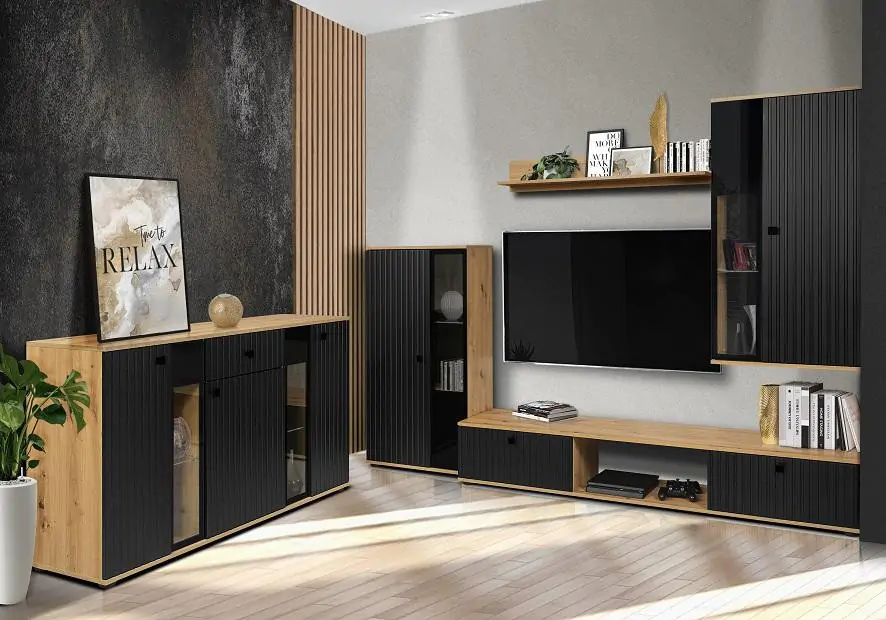 Dodejte interiéru špetku moderního stylu a doplňte jej o obývací stěnu SALSA, která se stane jeho nepřehlédnutelnou součástí! Nábytek je vyroben z kvalitního lamina v kombinaci černé barvy a odstínu dub artisan s frézováním.