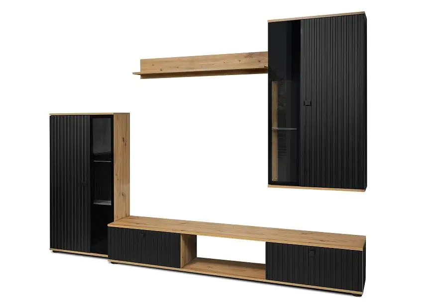 Obývací stěna sestává z TV stolku, závěsné police, stojící a závěsné vitríny s čirým sklem.
