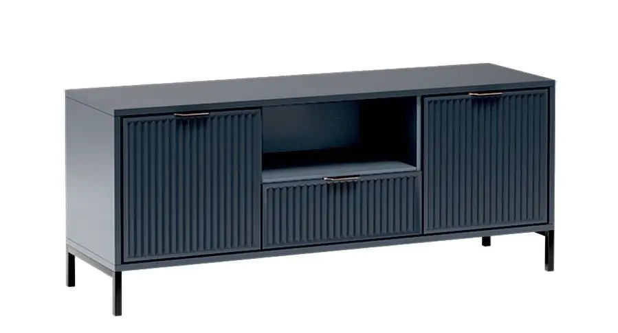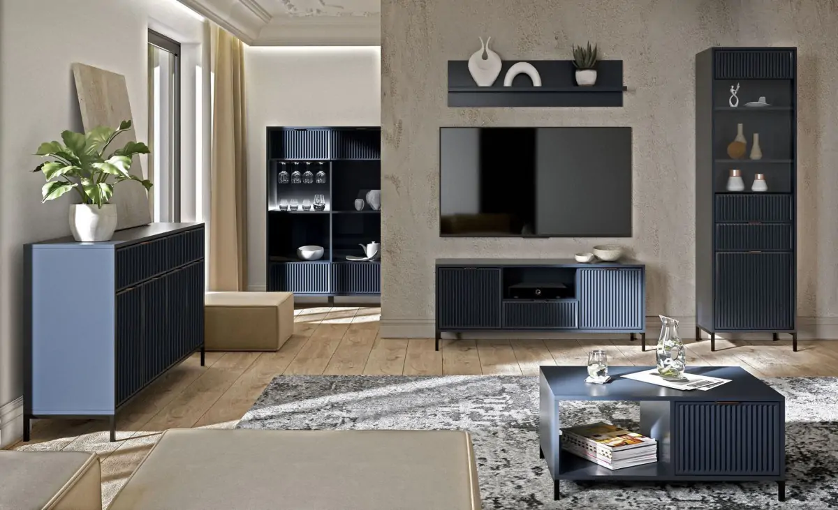 Obývací stěna ODEON v neobvyklém odstínu tmavě modré barvy indigo, skvěle doplní každý moderní interiér obývacího pokoje! Jemné tóny doplňují kovové nožky kontrastní černé barvy. Přední části nábytku jsou zdobeny frézováním.