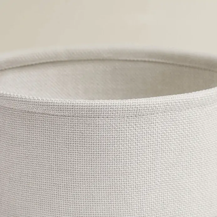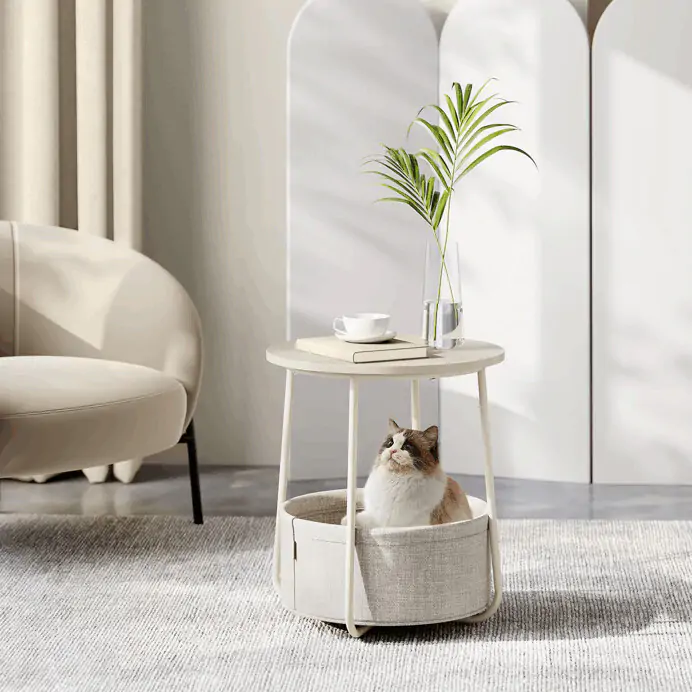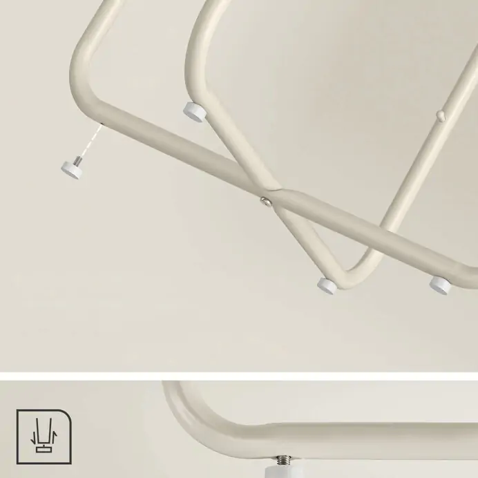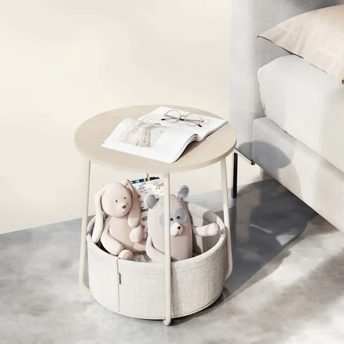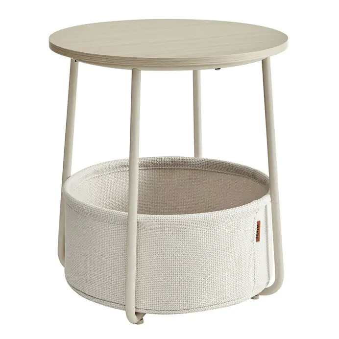 Deska je vyrobena z MDF v kašmírovém odstínu, který působí jemně a neutrálně. Pod deskou je umístěn textilní koš v krémové barvě, který poskytuje prostor pro uložení drobných předmětů a pomáhá udržet pořádek. Kovové nohy v béžovém provedení zajišťují stabilitu a pevnost stolku.