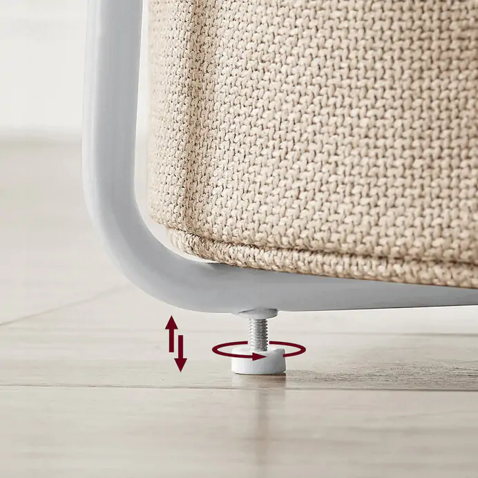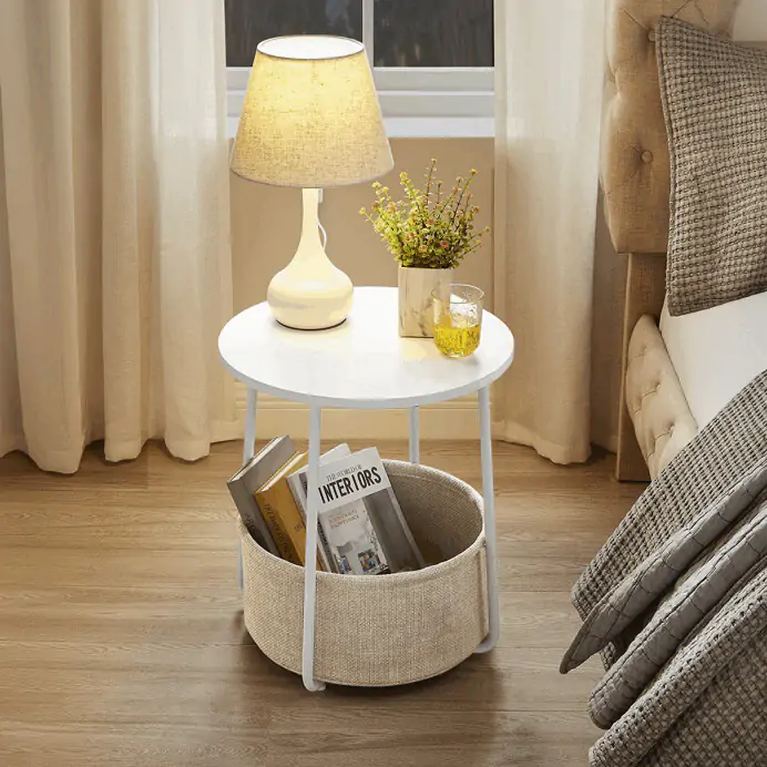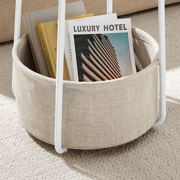 Deska je vyrobena z MDF v bílé barvě s hladkým povrchem, který se snadno udržuje. Stabilní kovové nohy v bílé barvě zajišťují pevnost a stabilitu stolku. Součástí je textilní koš v přírodním odstínu, který poskytuje dodatečný úložný prostor pro drobnosti a pomáhá udržet pořádek.