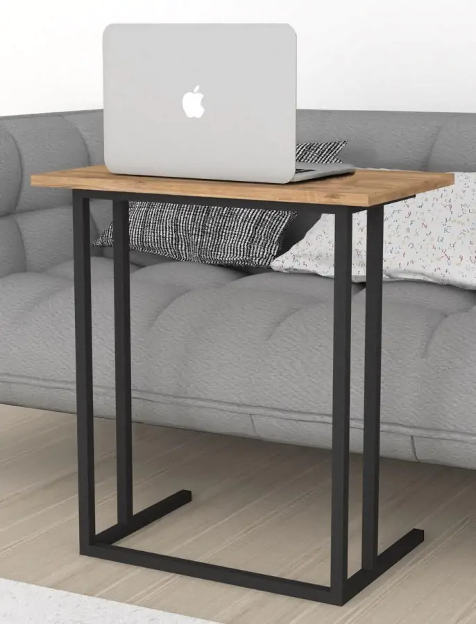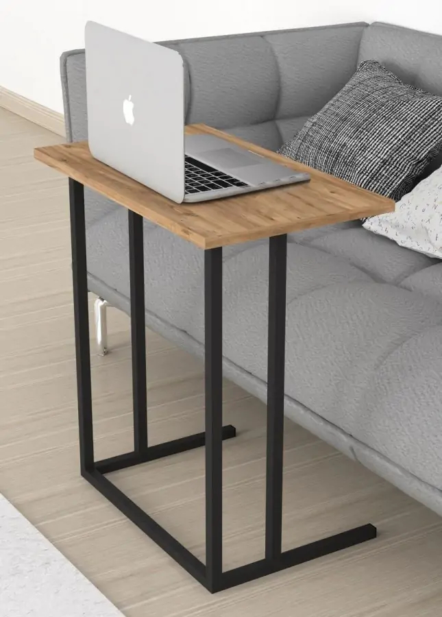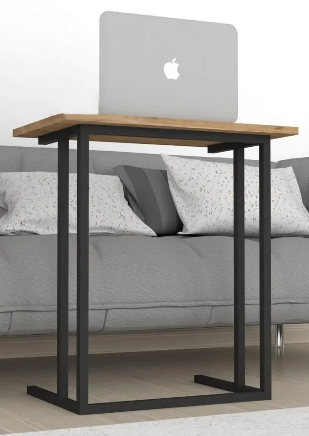 Odkládací příruční stolek FRANZ vhodný třeba na notebook je z kovového rámu v matné černé barvě a odkládací plocha je z kvalitní LTD desky v barvě borovice.