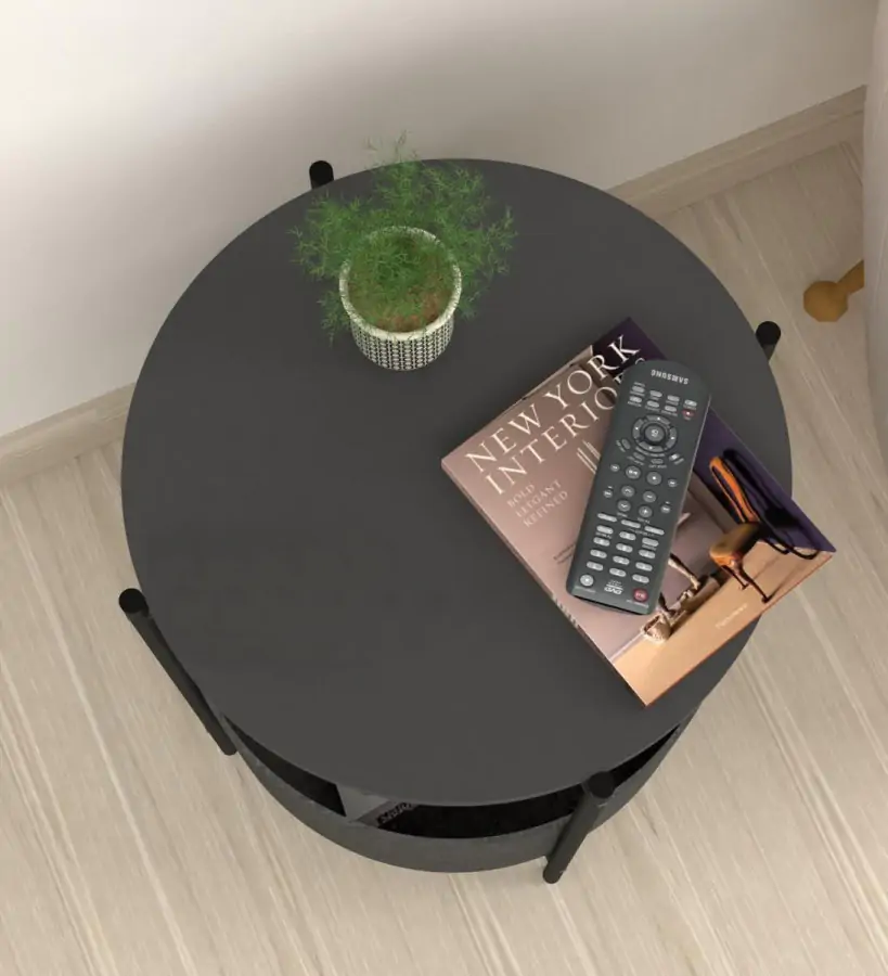 Kulatý odkládací/konferenční stolek JUDITH je z kovového rámu v matné černé barvě a horní deska je vyrobena z kvalitní LTD desky v barvě antracit.