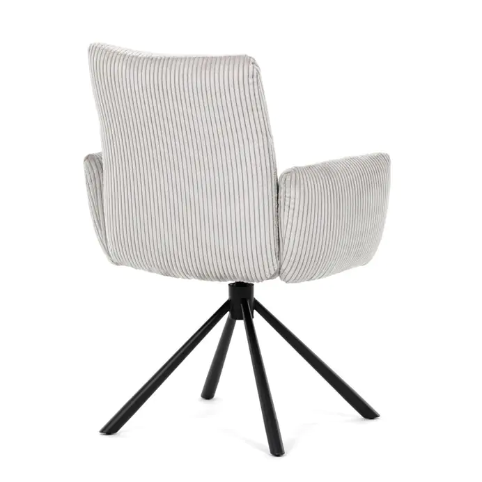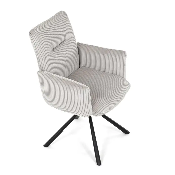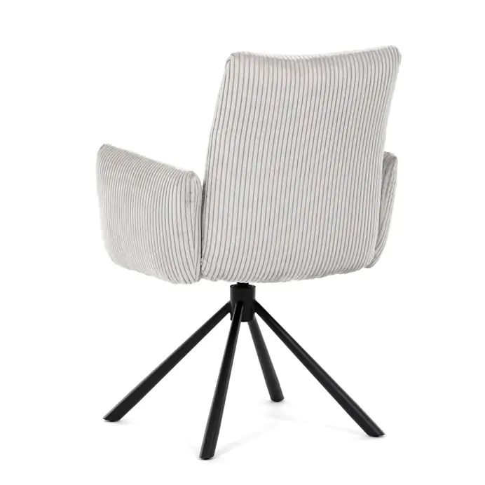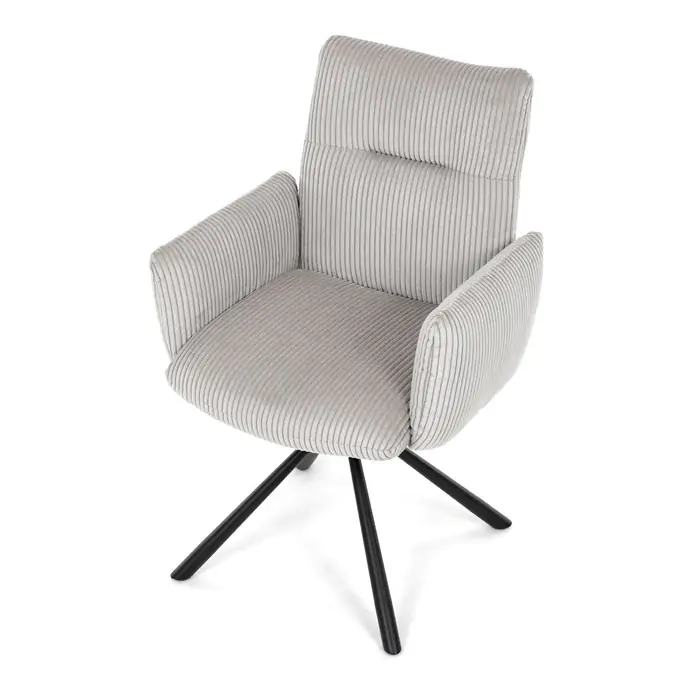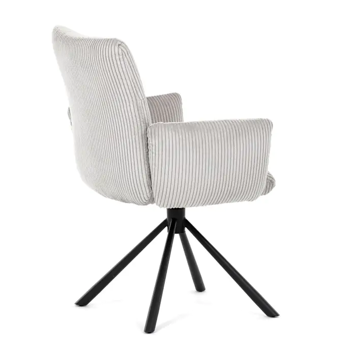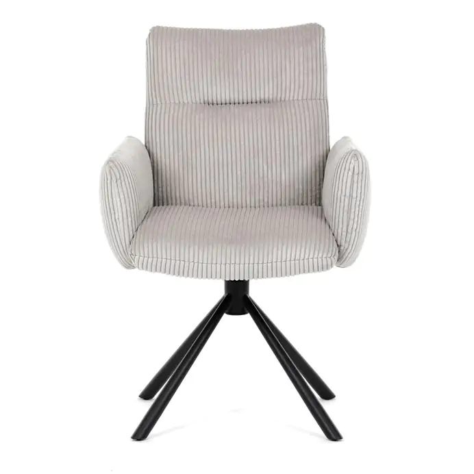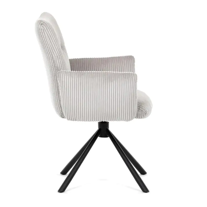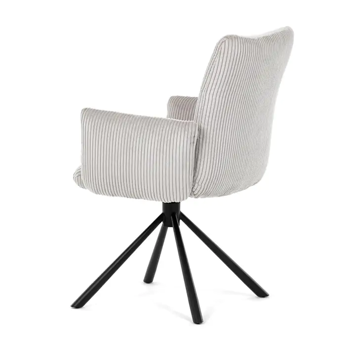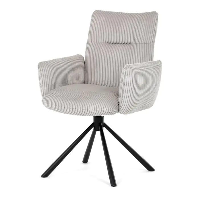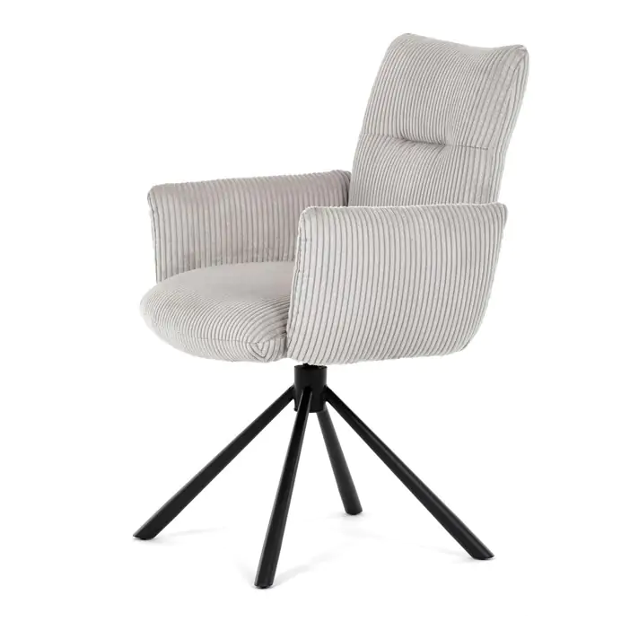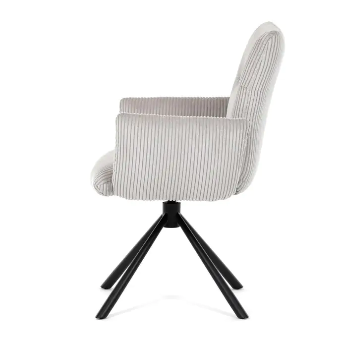 Potah z jemné manšestrové látky zajišťuje příjemný dotek a vizuálně podtrhuje nadčasový vzhled židle. Konstrukce nohou je vyrobena z černě práškovaného kovu, který poskytuje stabilitu a dlouhodobou odolnost proti opotřebení. Otočný 360° vratný mechanismus umožňuje plynulý a tichý pohyb, což zvyšuje ergonomii a usnadňuje manipulaci s židlí v jídelním prostoru. Vyšší polstrování přispívá k pohodlnému sezení i při delším užívání, zatímco pevné područky podporují správnou polohu paží a přispívají k celkové ergonomii.