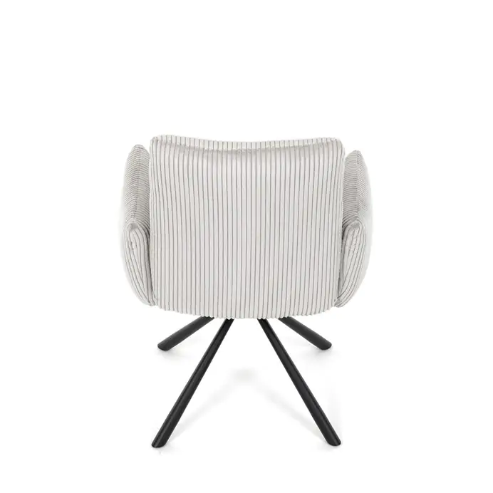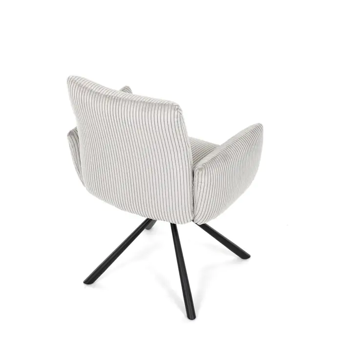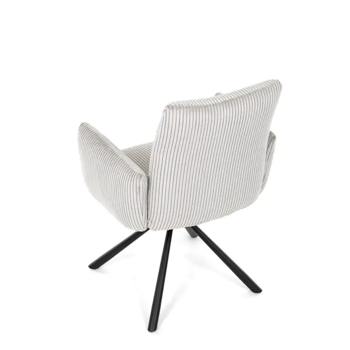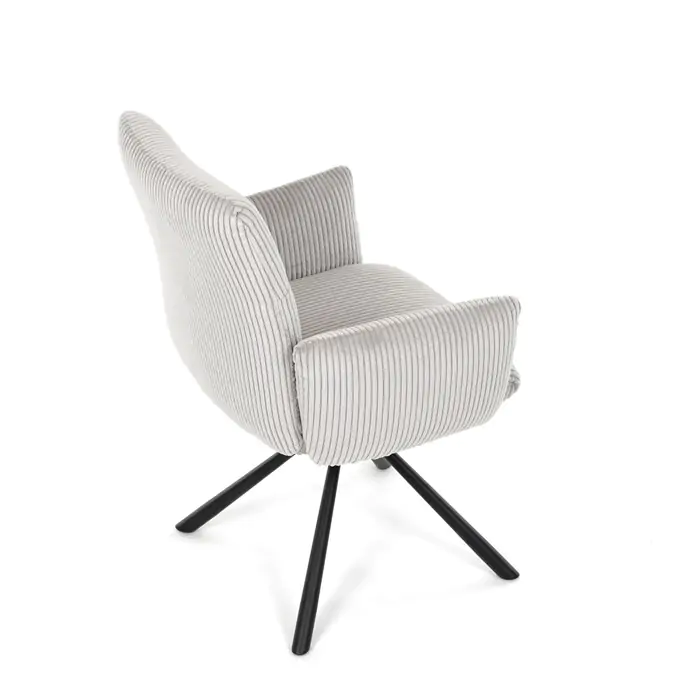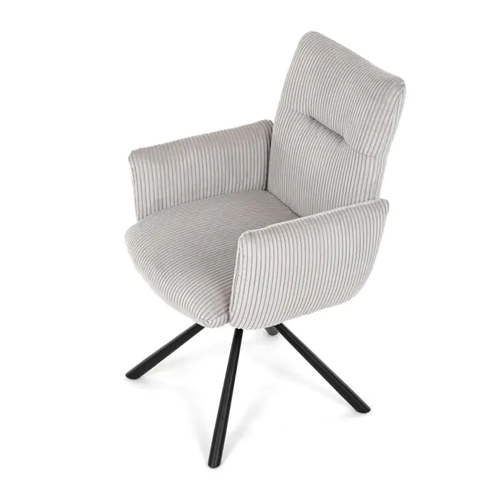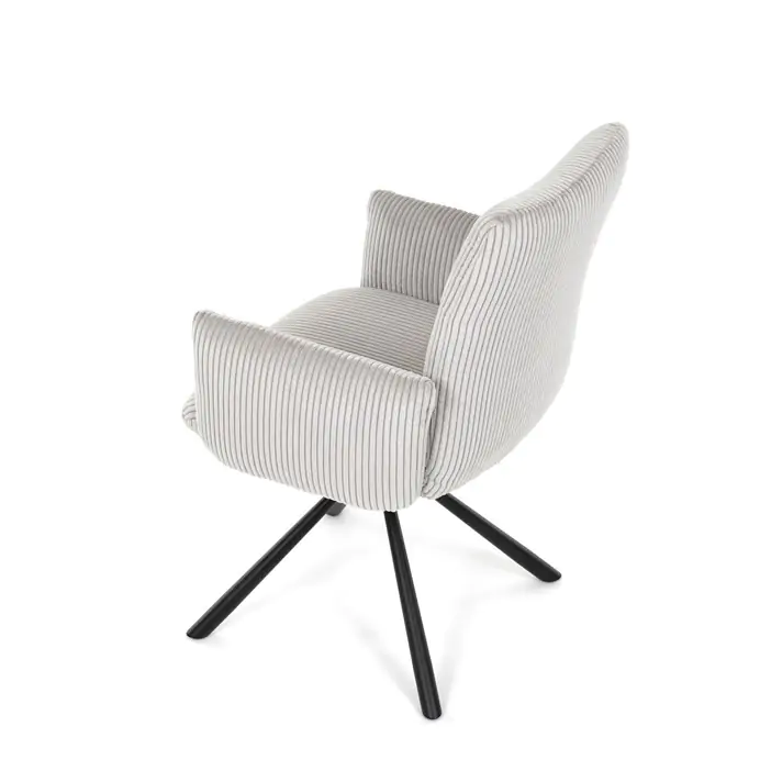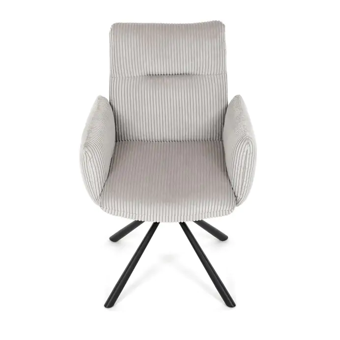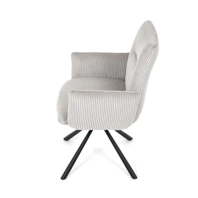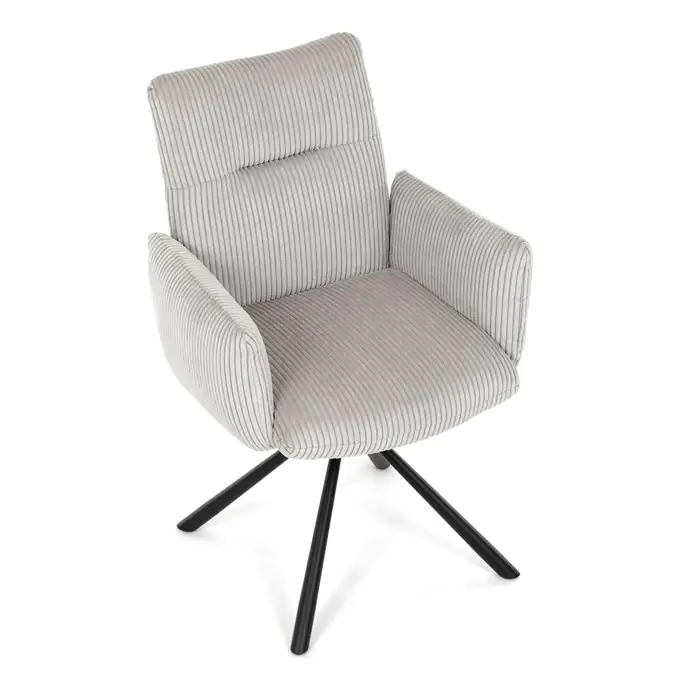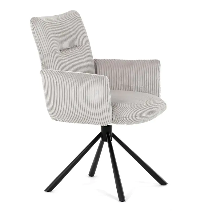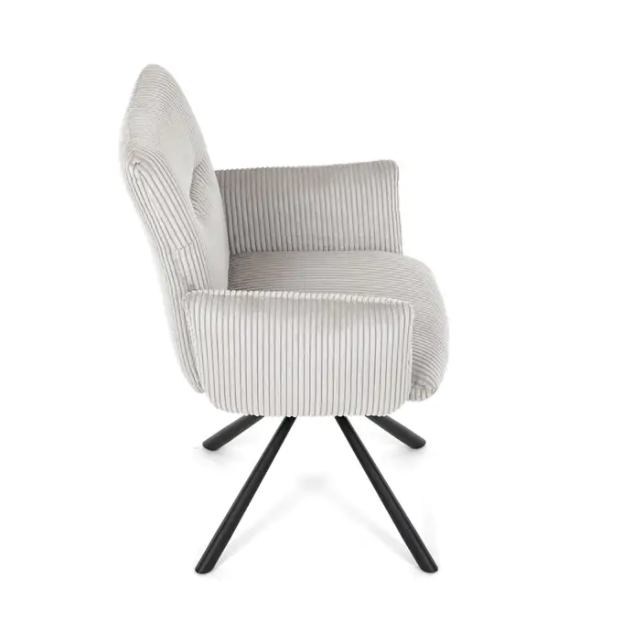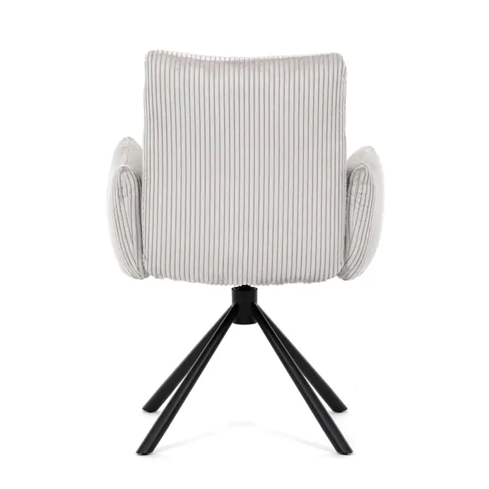 Potah z jemné manšestrové látky zajišťuje příjemný dotek a vizuálně podtrhuje nadčasový vzhled židle. Konstrukce nohou je vyrobena z černě práškovaného kovu, který poskytuje stabilitu a dlouhodobou odolnost proti opotřebení. Otočný 360° vratný mechanismus umožňuje plynulý a tichý pohyb, což zvyšuje ergonomii a usnadňuje manipulaci s židlí v jídelním prostoru. Vyšší polstrování přispívá k pohodlnému sezení i při delším užívání, zatímco pevné područky podporují správnou polohu paží a přispívají k celkové ergonomii.