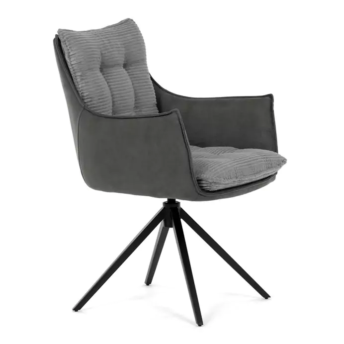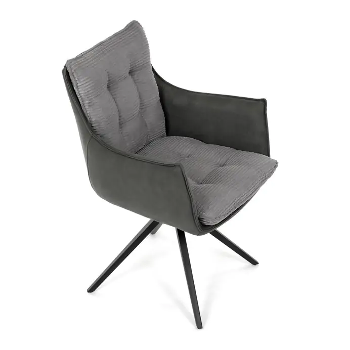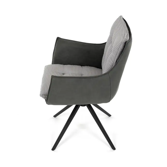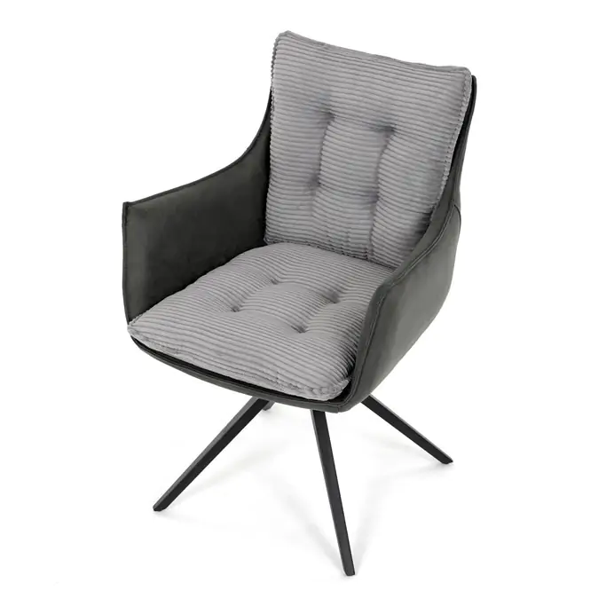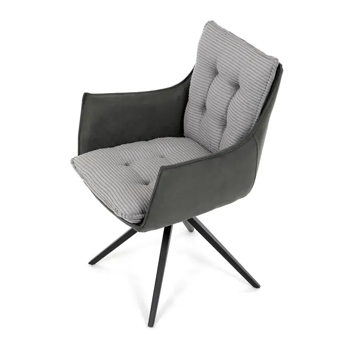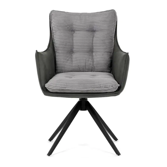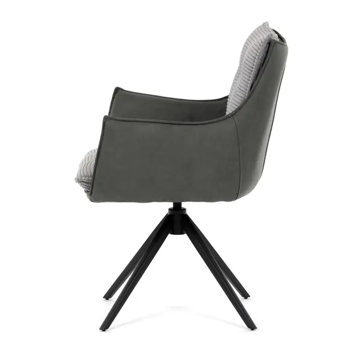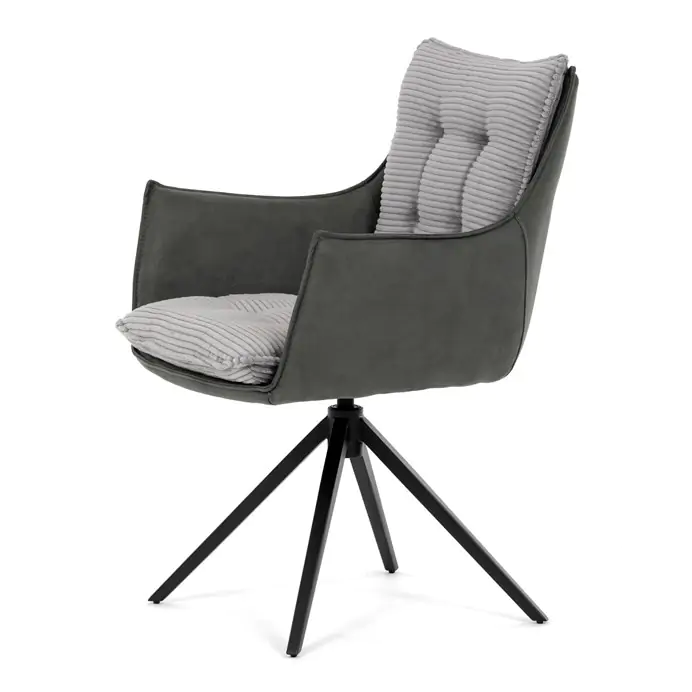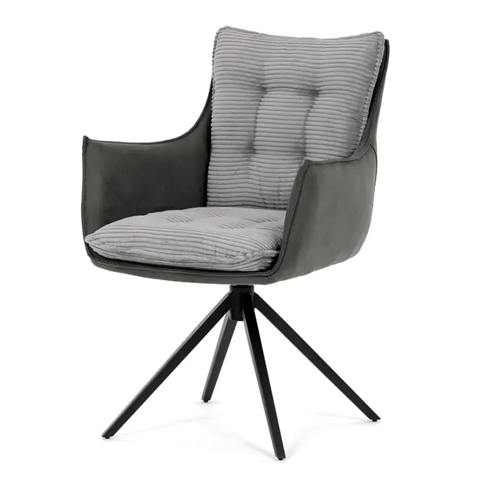 Konstrukce židle kombinuje pevný černý kovový rám s moderním designem čtyřnohé podnože, která zaručuje stabilitu a dlouhou životnost. Sedák a opěradlo jsou potaženy kombinací dvou typů šedé látky, vnitřní manšestrová s vysokým polstrováním, které poskytuje ergonomickou podporu a komfort i při delším sezení. Čalounění je pečlivě prošité a tvarované tak, aby zvýraznilo estetiku a zároveň zajistilo dostatečnou prodyšnost materiálu. Područky jsou integrovány do celkové konstrukce sedáku, což zvyšuje komfort bez omezení pohybu. Díky kombinaci kvalitních materiálů a funkčních prvků je židle vhodná pro moderní jídelny i pracovní prostory, kde je kladen důraz na design i uživatelský komfort.