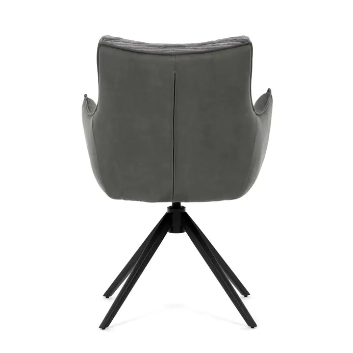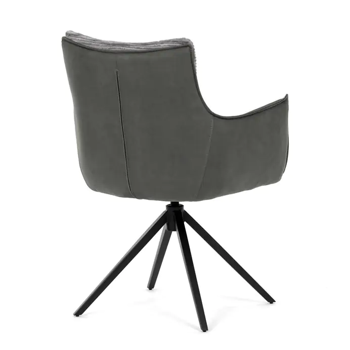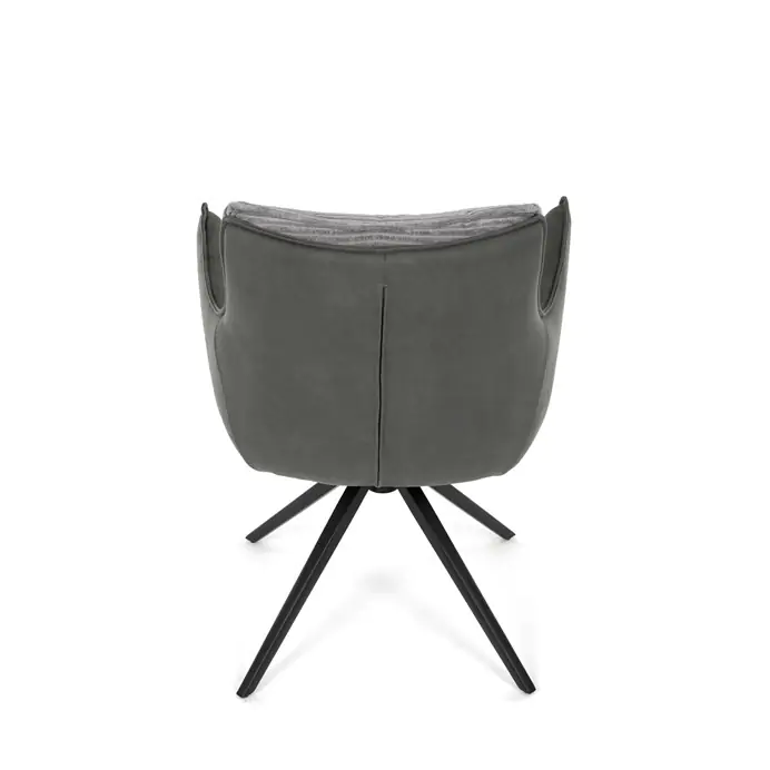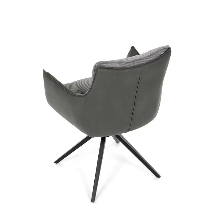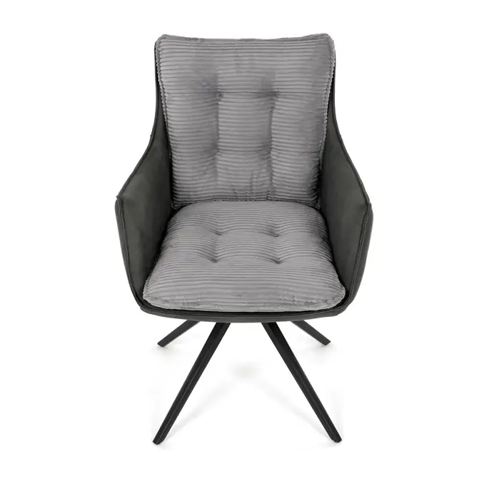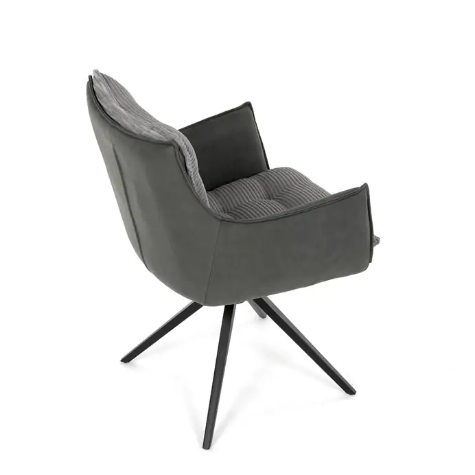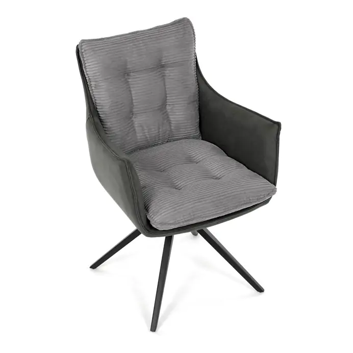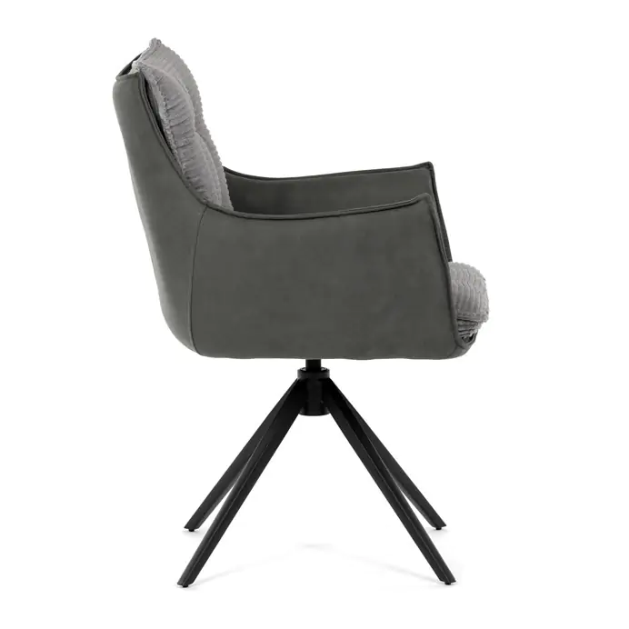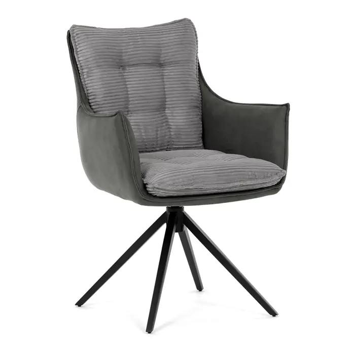 Konstrukce židle kombinuje pevný černý kovový rám s moderním designem čtyřnohé podnože, která zaručuje stabilitu a dlouhou životnost. Sedák a opěradlo jsou potaženy kombinací dvou typů šedé látky, vnitřní manšestrová s vysokým polstrováním, které poskytuje ergonomickou podporu a komfort i při delším sezení. Čalounění je pečlivě prošité a tvarované tak, aby zvýraznilo estetiku a zároveň zajistilo dostatečnou prodyšnost materiálu. Područky jsou integrovány do celkové konstrukce sedáku, což zvyšuje komfort bez omezení pohybu. Díky kombinaci kvalitních materiálů a funkčních prvků je židle vhodná pro moderní jídelny i pracovní prostory, kde je kladen důraz na design i uživatelský komfort.