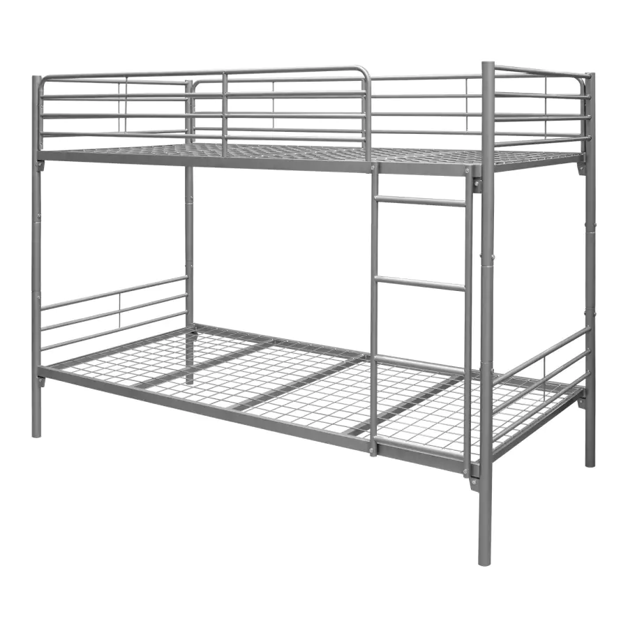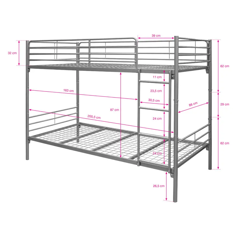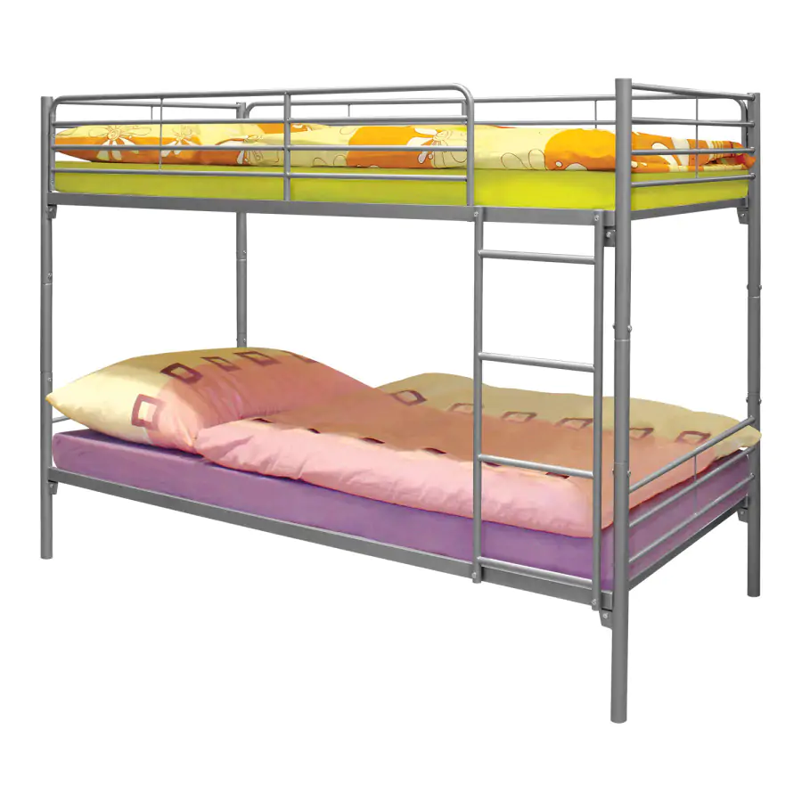 Dvoupatrová postel s kovovou konstrukcí v barevném provedení stříbrná.