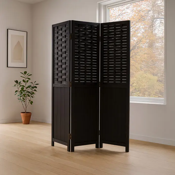Třídílný paraván EF-L145 BK z masivního smrkového dřeva v černém provedení nabízí praktické řešení pro rozdělení prostoru s výrazným přírodním dekorem. Horní část tvoří propletené lamely, které...