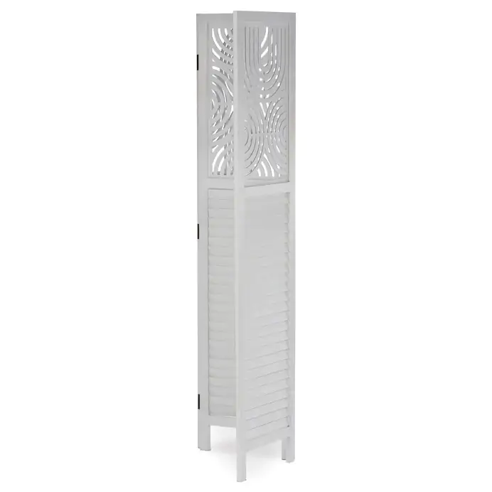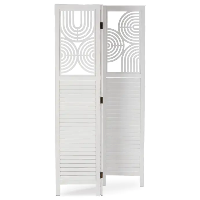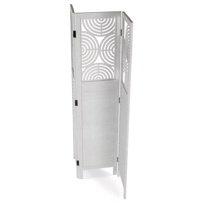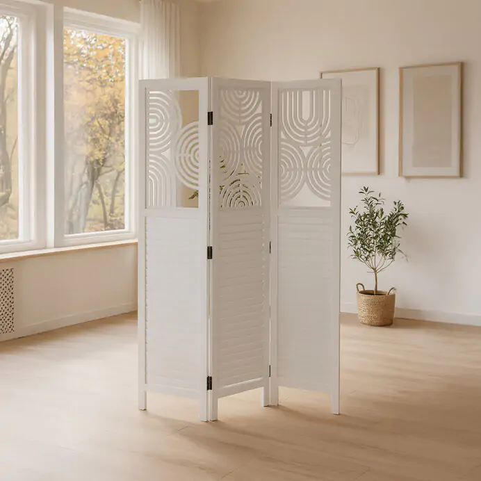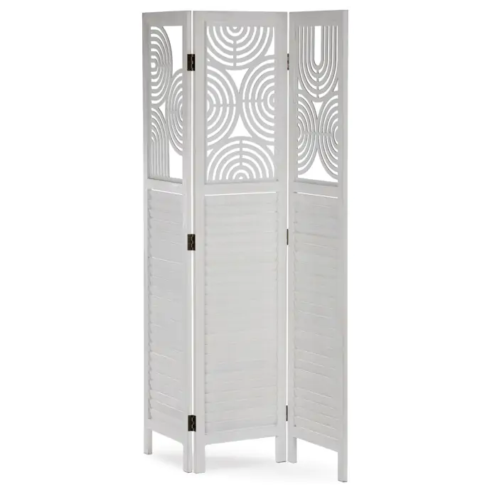 Třípanelový paraván EF-L175 WT vyrobený z masivního smrkového dřeva v bílé barvě nabízí praktické řešení pro rozdělení prostoru v interiéru. Každý díl je doplněn dekorativními výřezy v horní části, které propouštějí světlo a zároveň zachovávají soukromí.