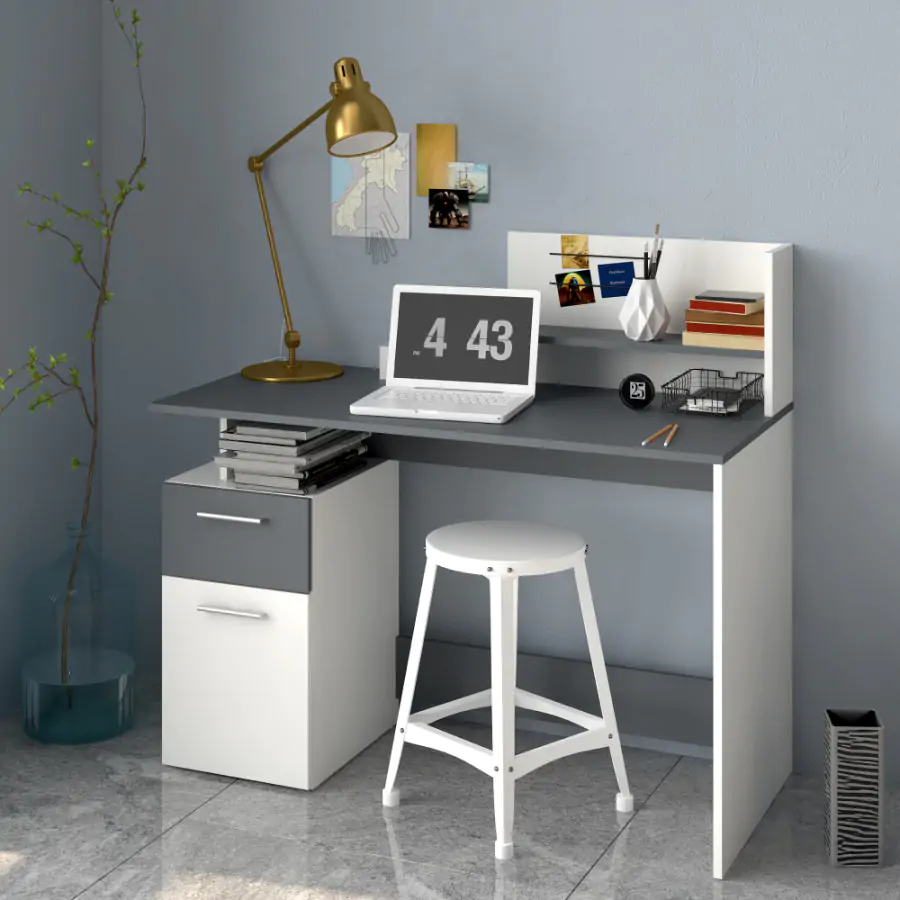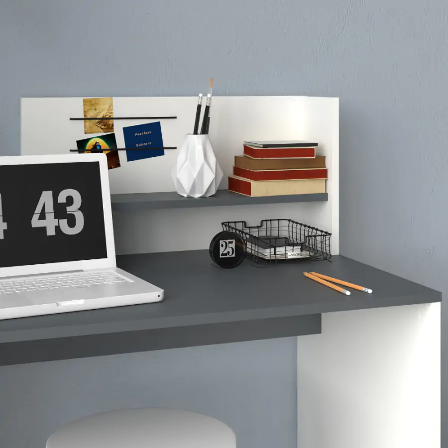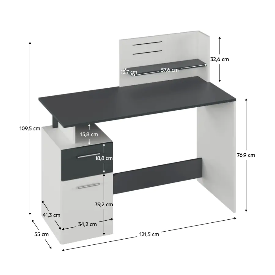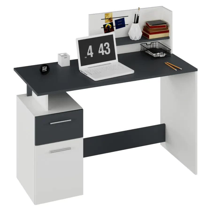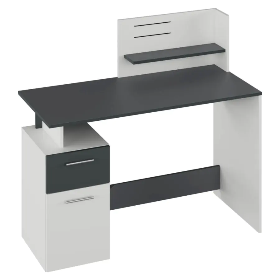 Je vyroben z kvalitního materiálu v podobě laminované dřevotřísky v jedinečném barevném provedení bílá/grafit. Obsahuje šuplík a větší otevřený prostor pro odkládání dokumentů. Stůl se vyznačuje svou nástavbou, která je prakticky postavena na vrchní části stolu.