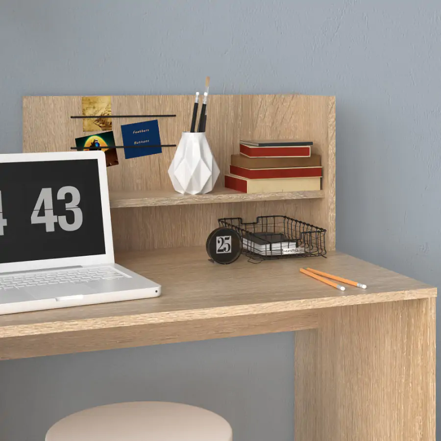 Je vyroben z kvalitního materiálu v podobě laminované dřevotřísky v jedinečném barevném provedení dub sonoma. Obsahuje šuplík a větší otevřený prostor pro odkládání dokumentů. Stůl se vyznačuje svou nástavbou, která je prakticky postavena na vrchní části stolu.