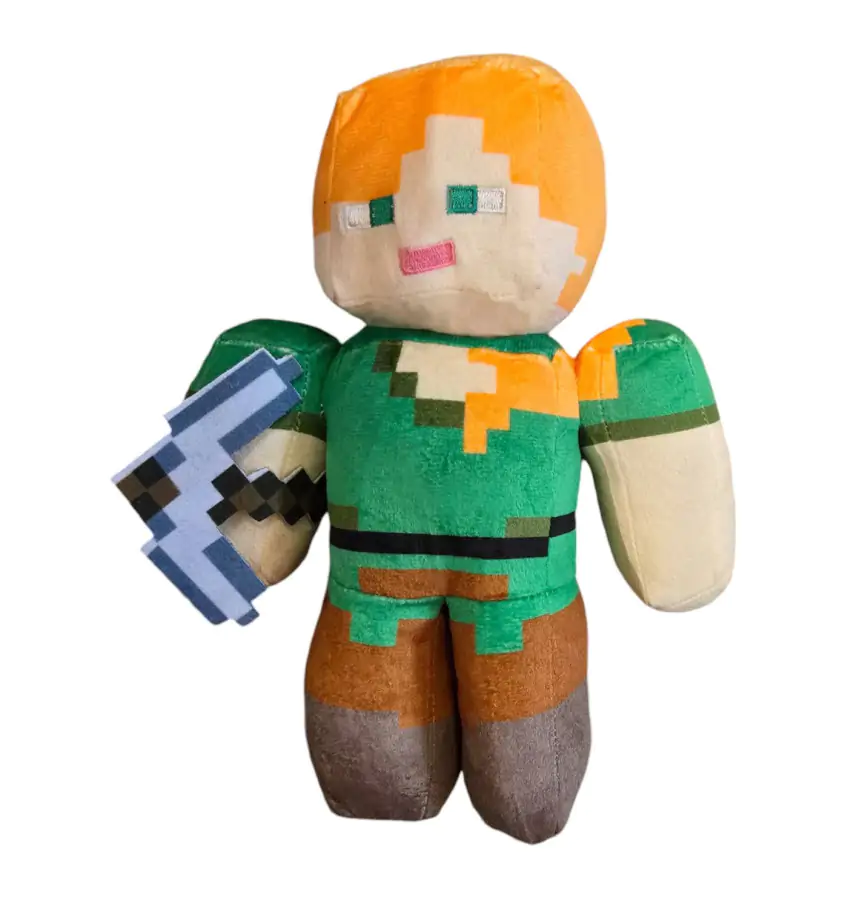 Plyšová hračka Minecraft Alex s krumpáčem představuje jednu z hlavních postav světa Minecraftu v typickém pixelovém designu.