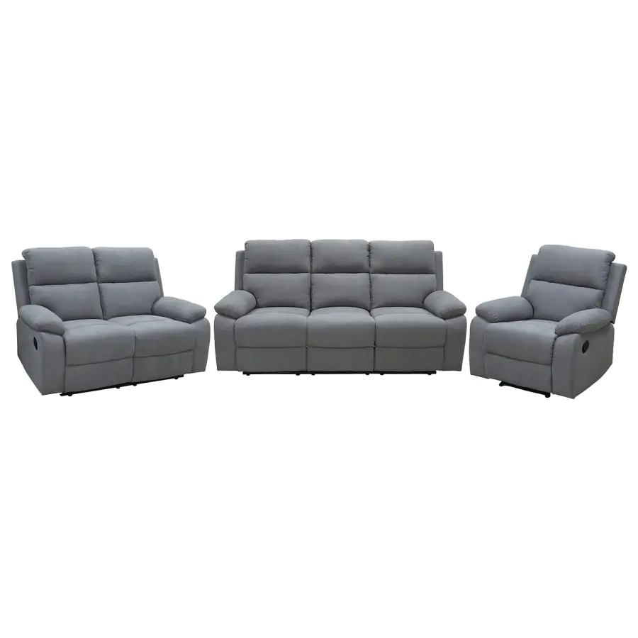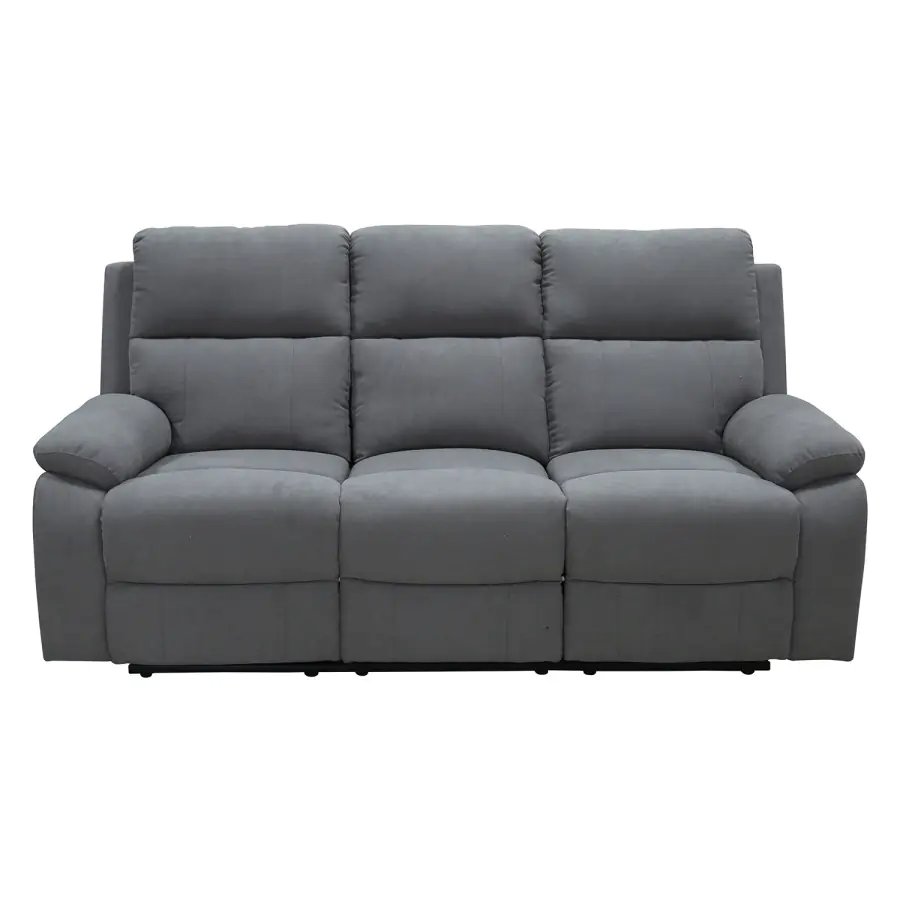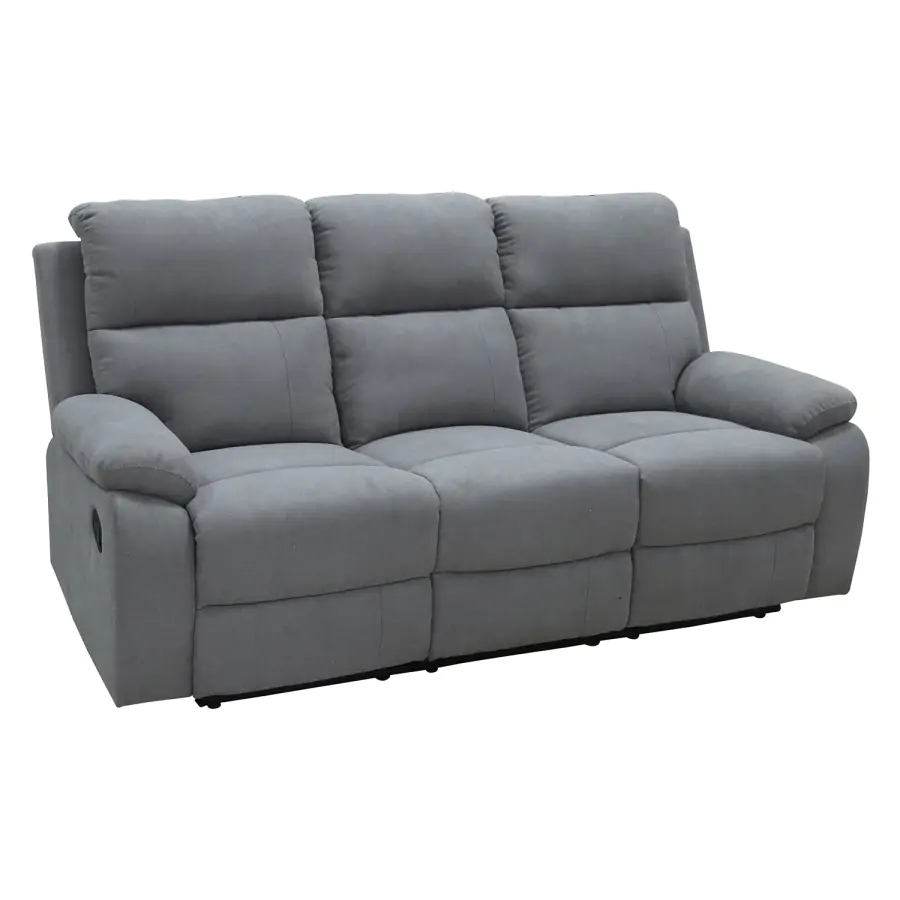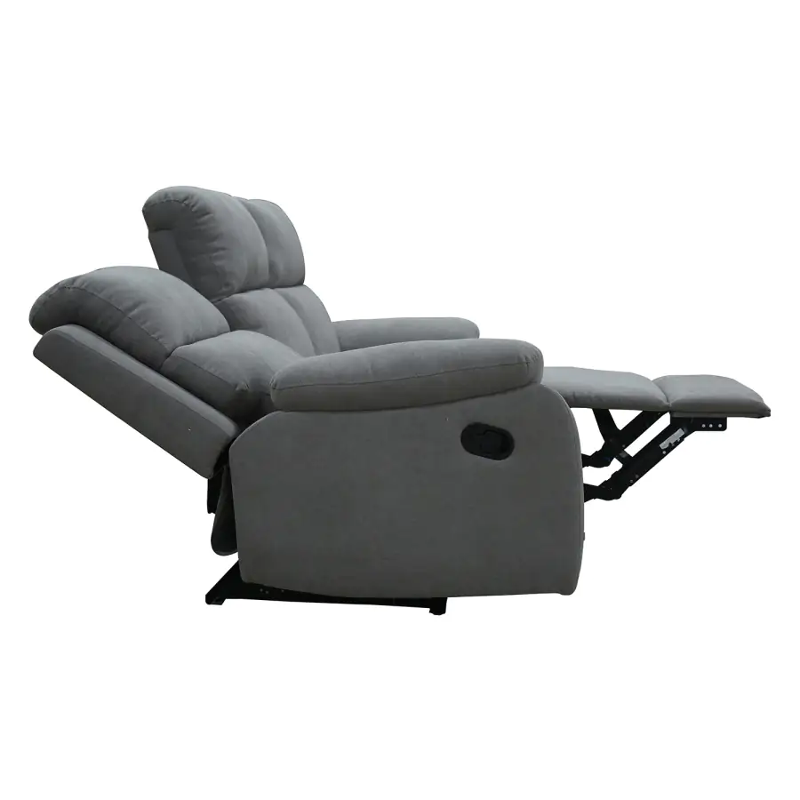 Trojmístná šedá pohovka má dva pevné a jeden polohovací sedák, takže si můžete jednoduše podepřít nohy při čtení či sledování televize.