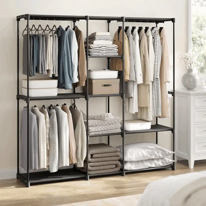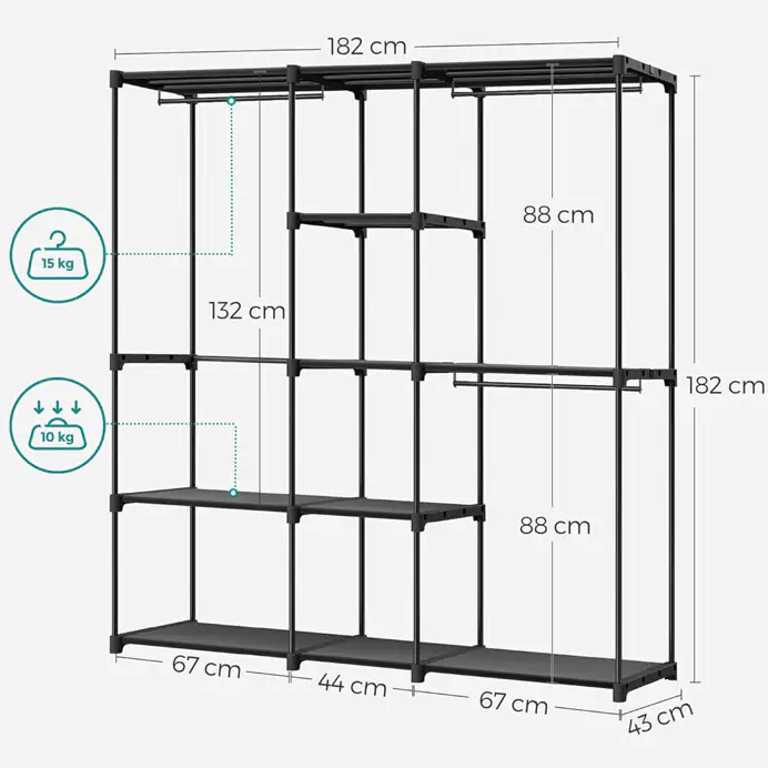 Praktická šatní stěna AST-E1002 BK v černém provedení nabízí praktické řešení úložného prostoru pro oděvy a doplňky. Je vyrobena z pevného kovu s plastovými a látkovými prvky, které zajišťují stabilitu a snadnou údržbu.