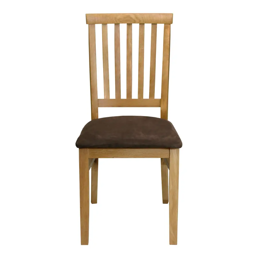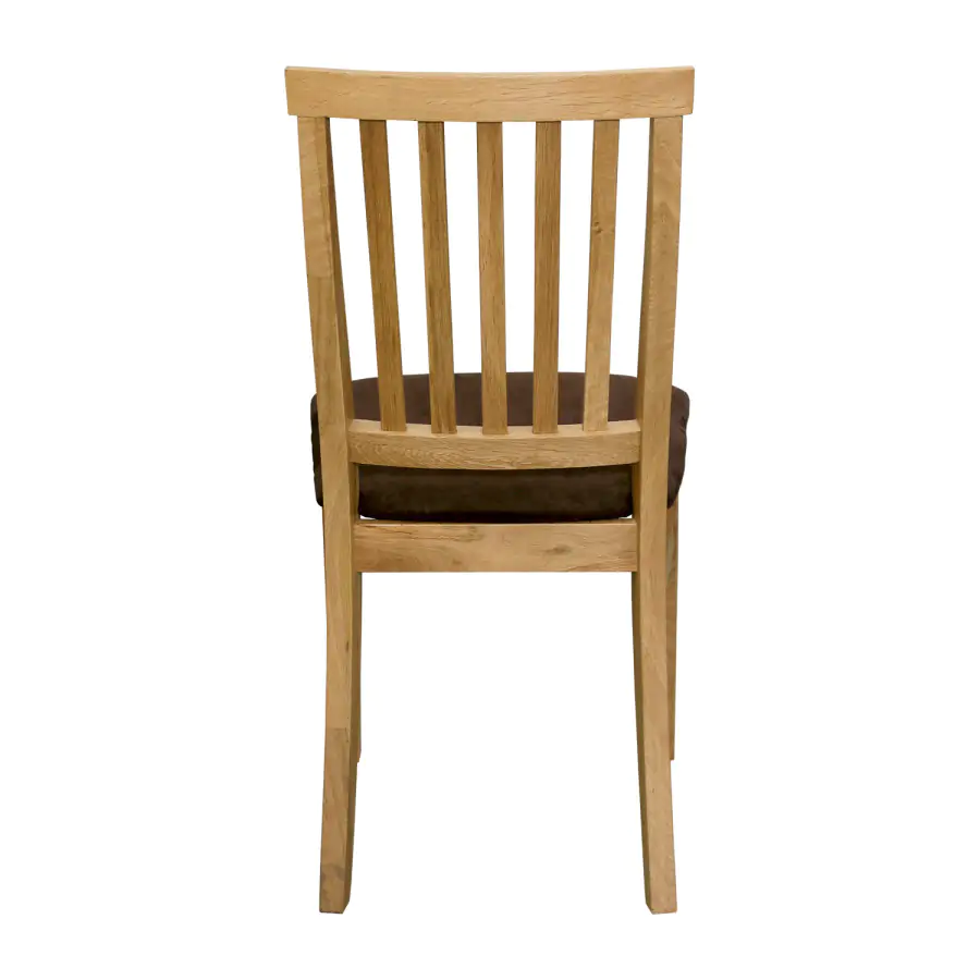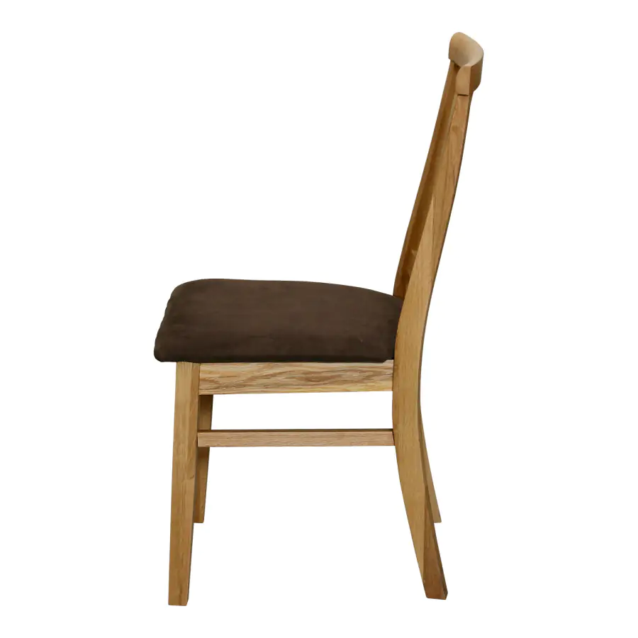 Jídelní židle je vyrobena z masivního dubu, povrchově upravena olejovým mořením a její polstrovaný sedák je imitací broušené kůže. Hnědý sedák je velice příjemný a odolný vůči ušpinění, navíc na dřevěné židli působí velice elegantně. Polstrované židle zajistí komfortní posezení celé vaší rodině.