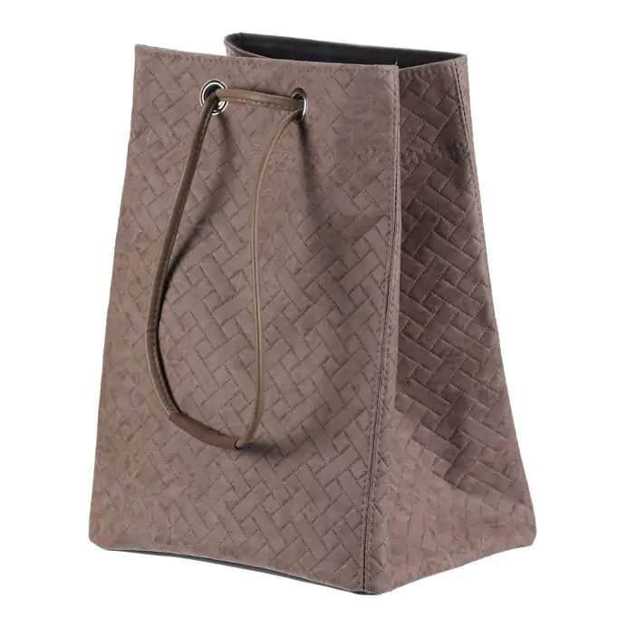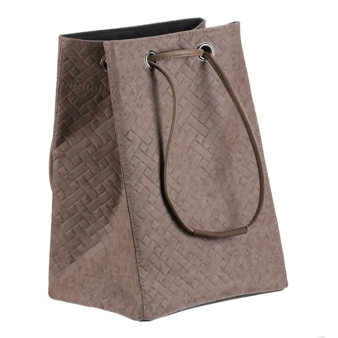 Má jemnou hnědou barvu, koženkový povrch a horní část se snadno uzavírá pomocí stahovací šňůry. Díky lehké konstrukci se s ním dobře manipuluje, je dobře skladovatelný a v interiéru působí i jako stylový doplněk, není tak pouze úložným prostorem.