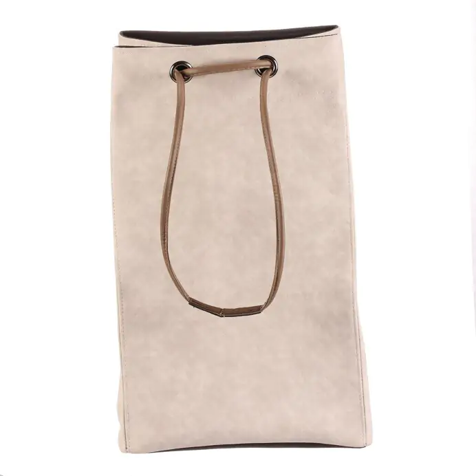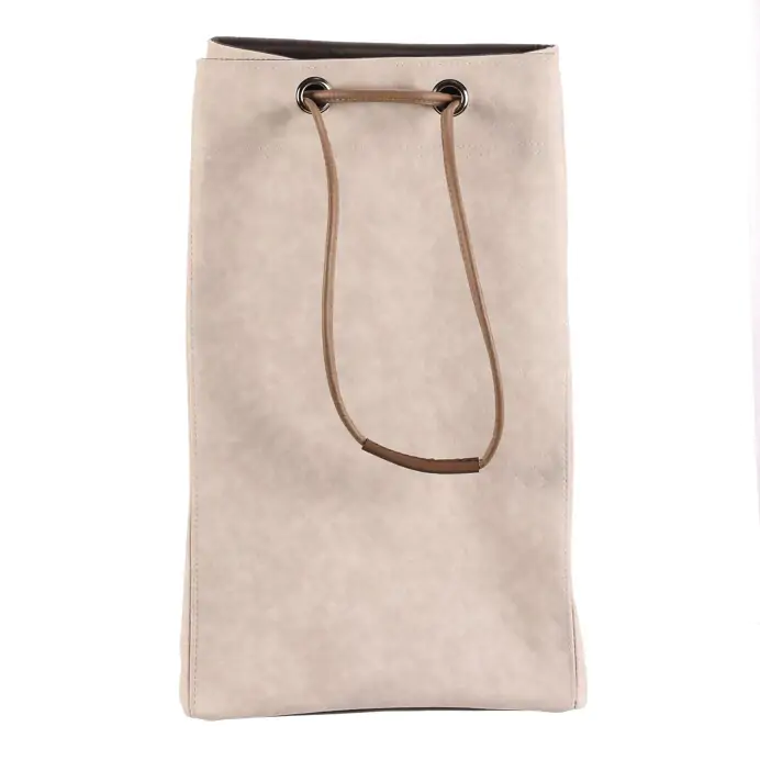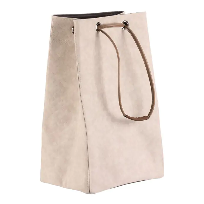 Má jemnou krémovou barvu, koženkový povrch a horní část se snadno uzavírá pomocí stahovací šňůry. Díky lehké konstrukci se s ním dobře manipuluje, je dobře skladovatelný a v interiéru působí i jako stylový doplněk, není tak pouze úložným prostorem.