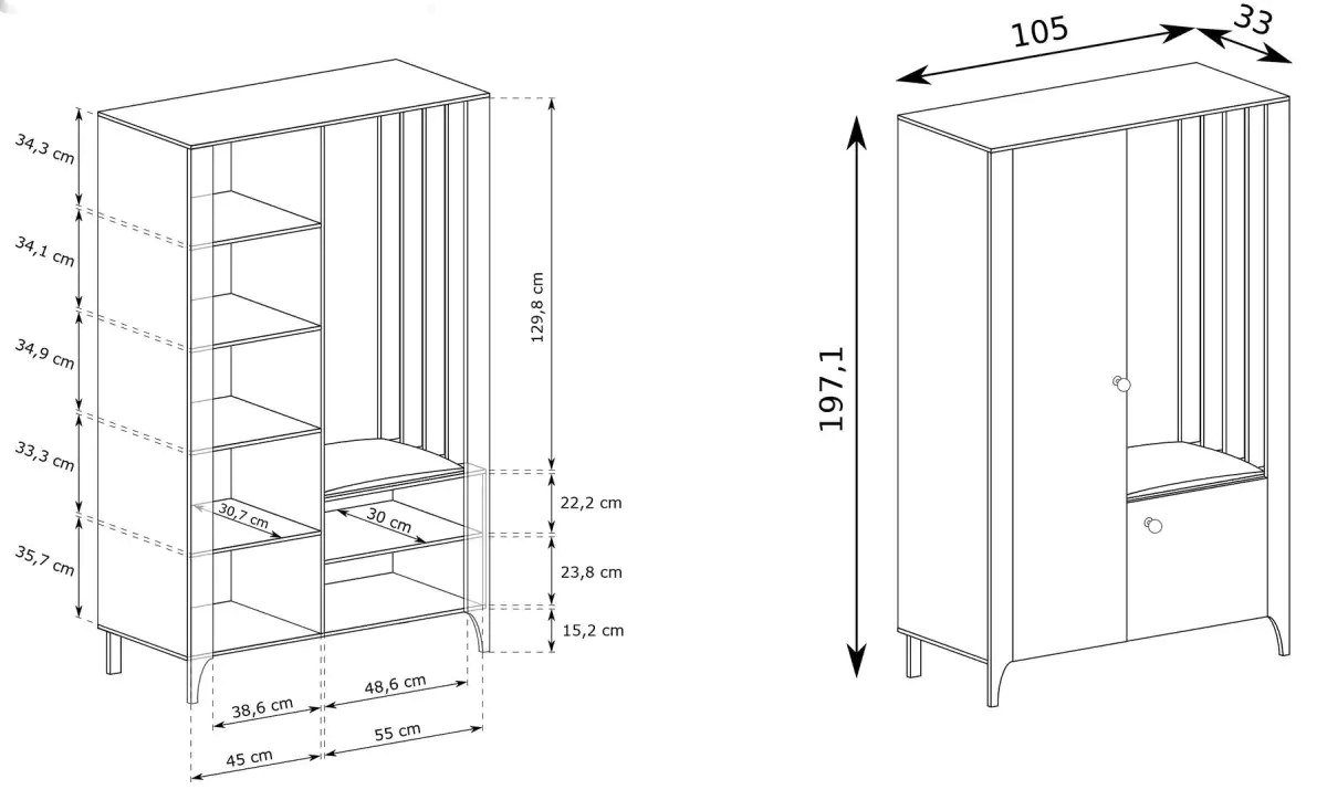 Díky šatní tyčí v jedné polovině a skříni vnitřními policemi v druhé + botník budete mít ve věcech konečně pořádek. Kvalitní výsuvy (soft close) a panty s tichým dovíráním se postarají o každodenní komfort. Rozměry viz obrázek.