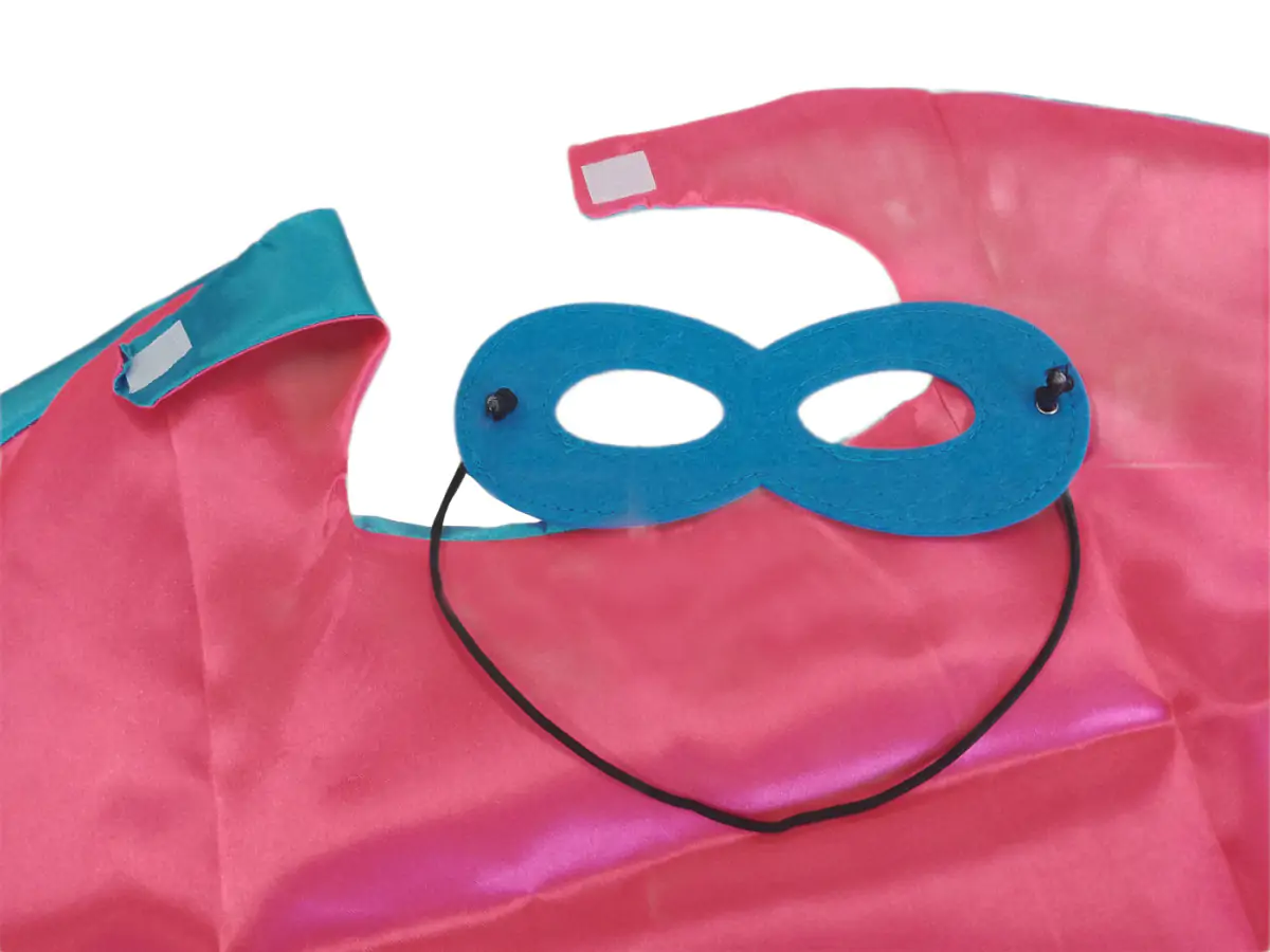Plášť je vyroben z jemného, lesklého saténového materiálu, který je na dotek příjemný a zároveň odolný při hraní. Z vnitřní strany má plášť kontrastní růžovou barvu, což dodává kostýmu hravý a stylový vzhled. Zapínání na suchý zip umožňuje snadné oblékání a svlékání i bez pomoci dospělých.