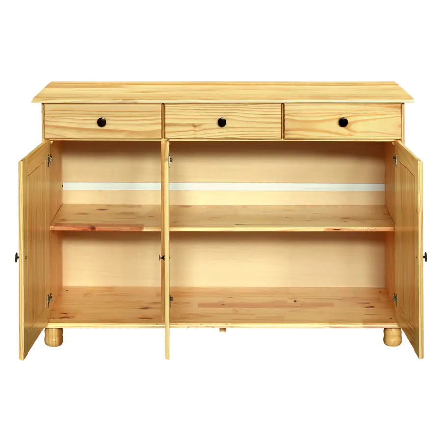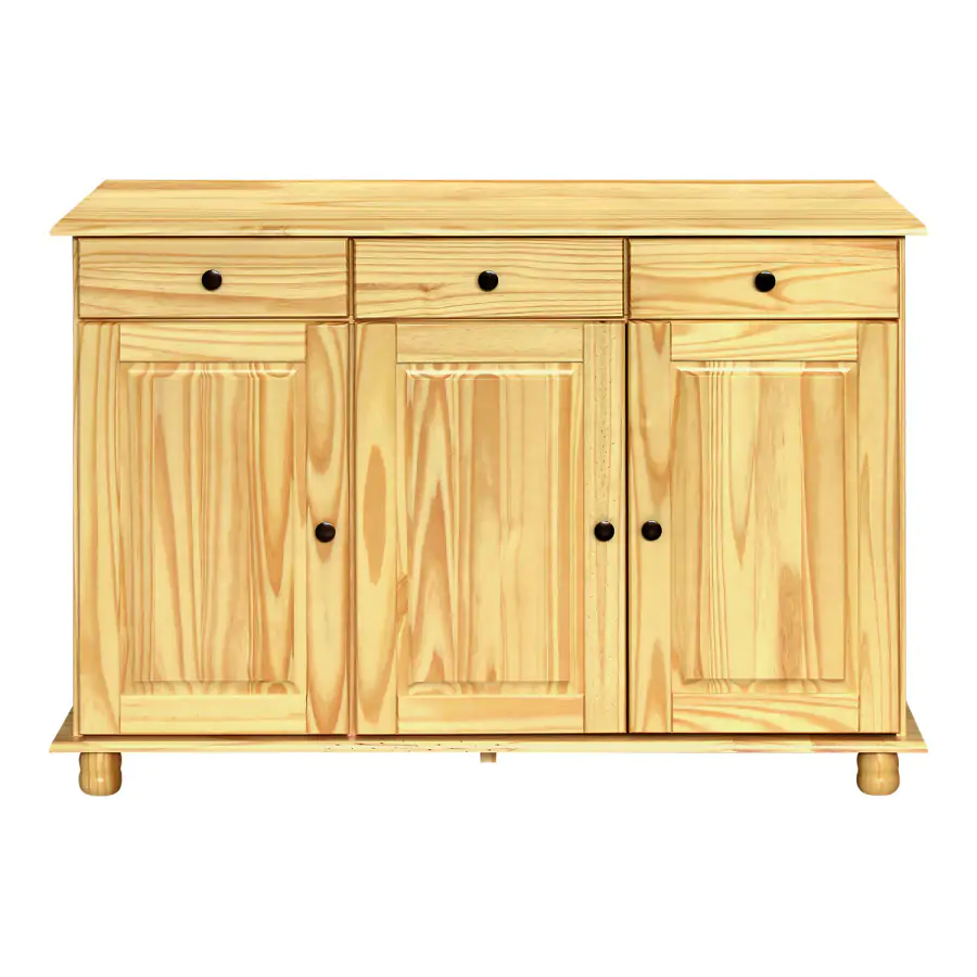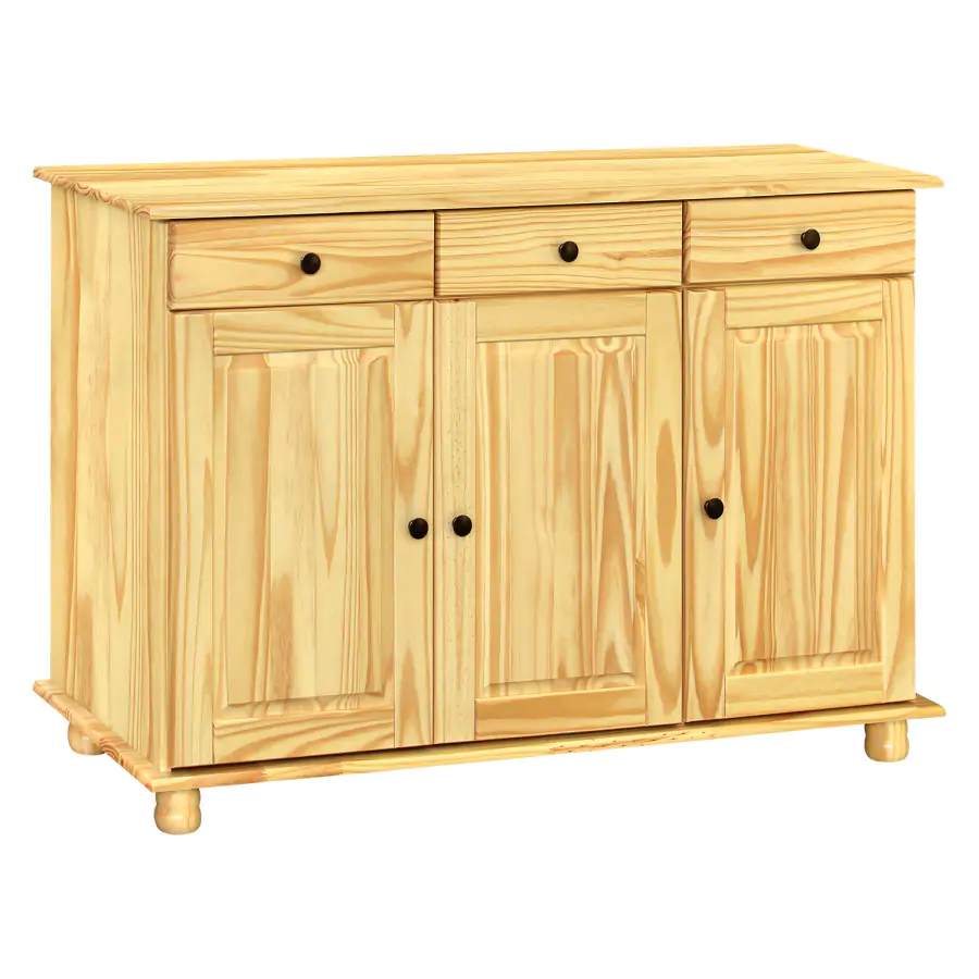 Příborník, prádelník, komoda, skříňka... cokoliv jen budete chtít. Využití třídveřového příborníku RUBI 8927N z masivního borovicového dřeva nalakovaného čirým lakem není ničím omezeno.