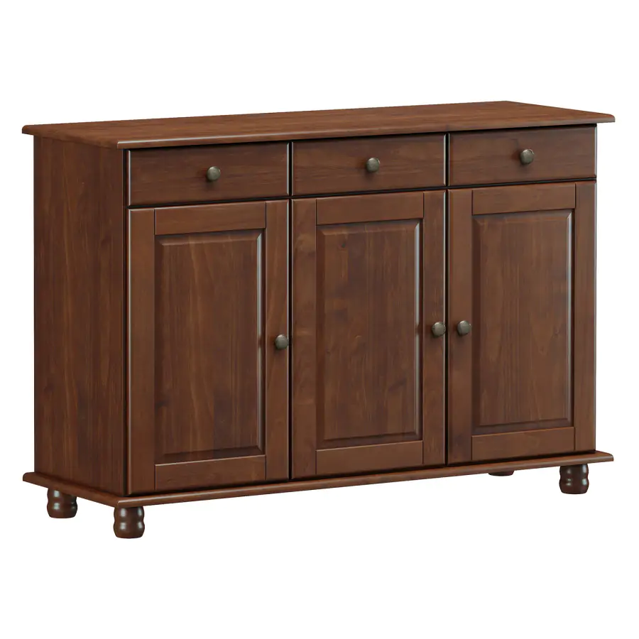 Příborník 3 dveře + 3 zásuvky RUBI lze využít na kuchyňské náčiní, nebo na uložení věcí ve vašem obývacím pokoji. Je vyroben z masivu borovice a je v barevném provedení tmavě hnědý lak. Doporučujeme jej tedy umístit spíše do světlejších místností. Docílíte tak skvělého kontrastu. Příborník je vybaven 3 zásuvkami s kovovými pojezdy a skříňkou se 3 dvířky, za kterými se nachází police.