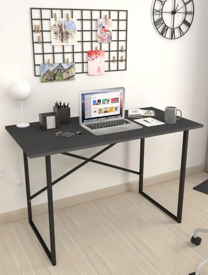 Stylový psací stůl ANGELA je z kovového rámu v matné černé barvě a pracovní deska je vyrobena z kvalitní LTD desky v barvě antracit. Dodáváme v demontovaném stavu.
