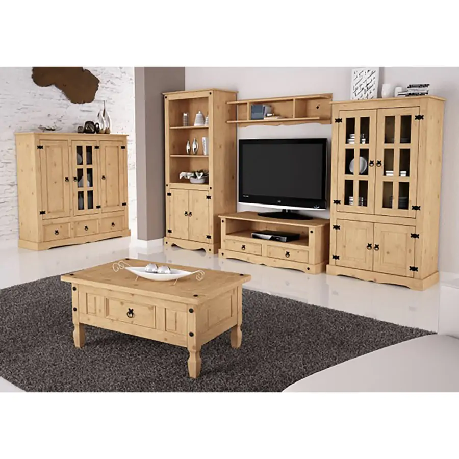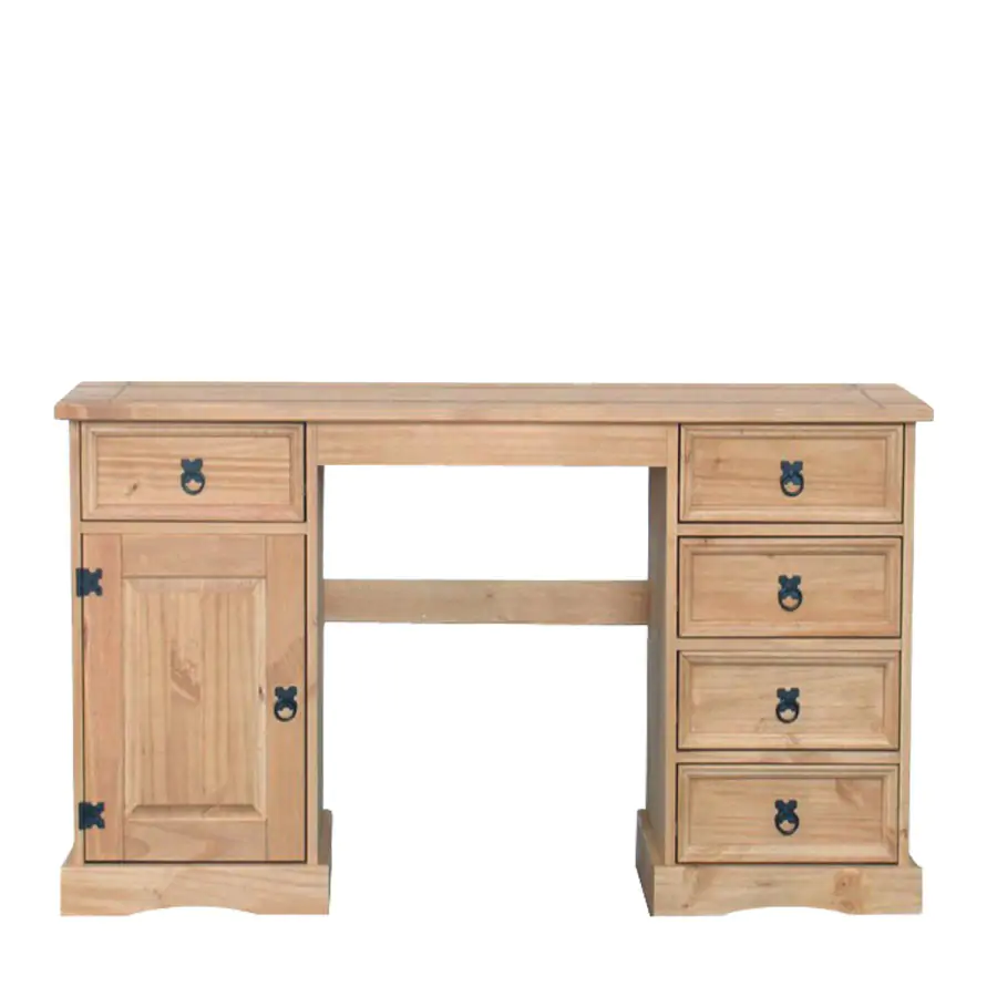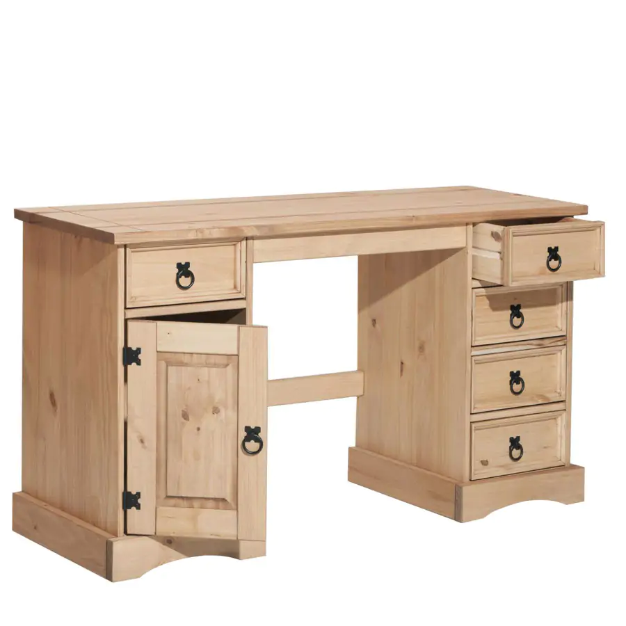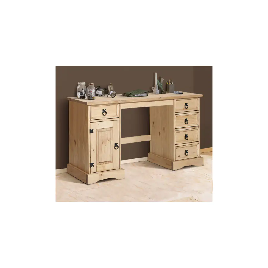 Prostorný psací stůl je zhotoven z masivní borovice, voskované provedení v medovém odstínu. Obsahuje 5 malých zásuvek, 1 dvířka, kovové ozdobné úchytky. Dodáváno v demontu.