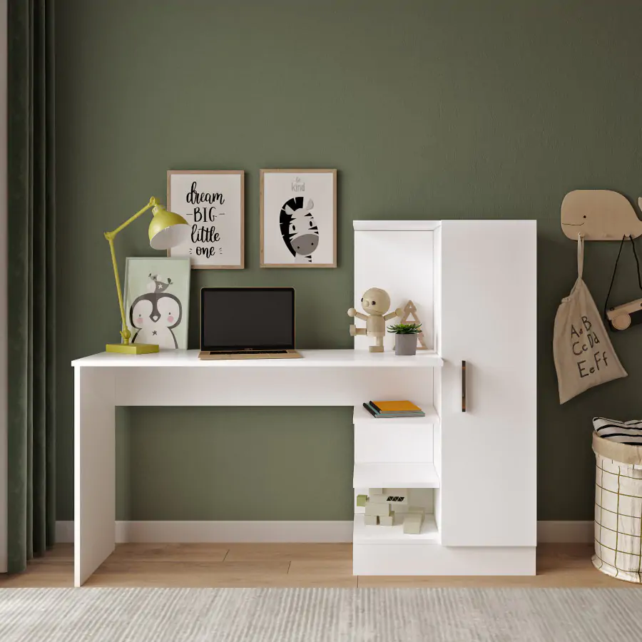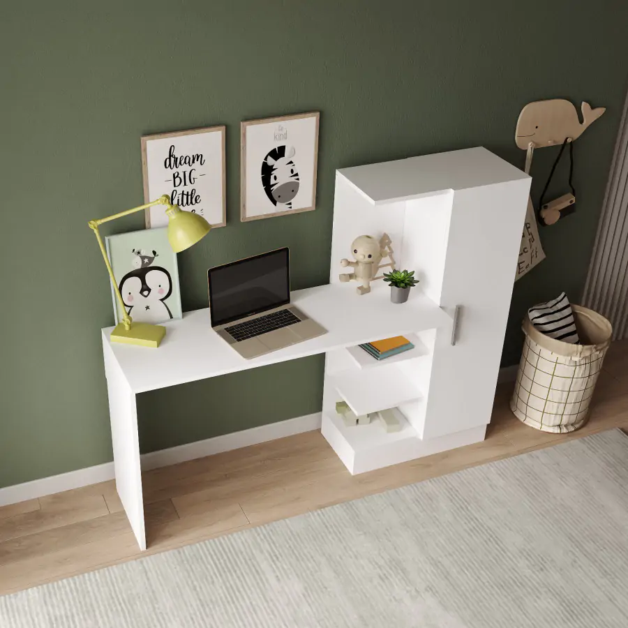 Nabízí praktické řešení pro každý prostor. Díky plným dvířkům a regálku poskytuje dostatek úložného prostoru pro knihy, dokumenty nebo kancelářské potřeby. Obdélníkový tvar stolu umožňuje snadné umístění do různých typů interiérů, zatímco skandinávský design přidává prostoru čistý a stylový vzhled.