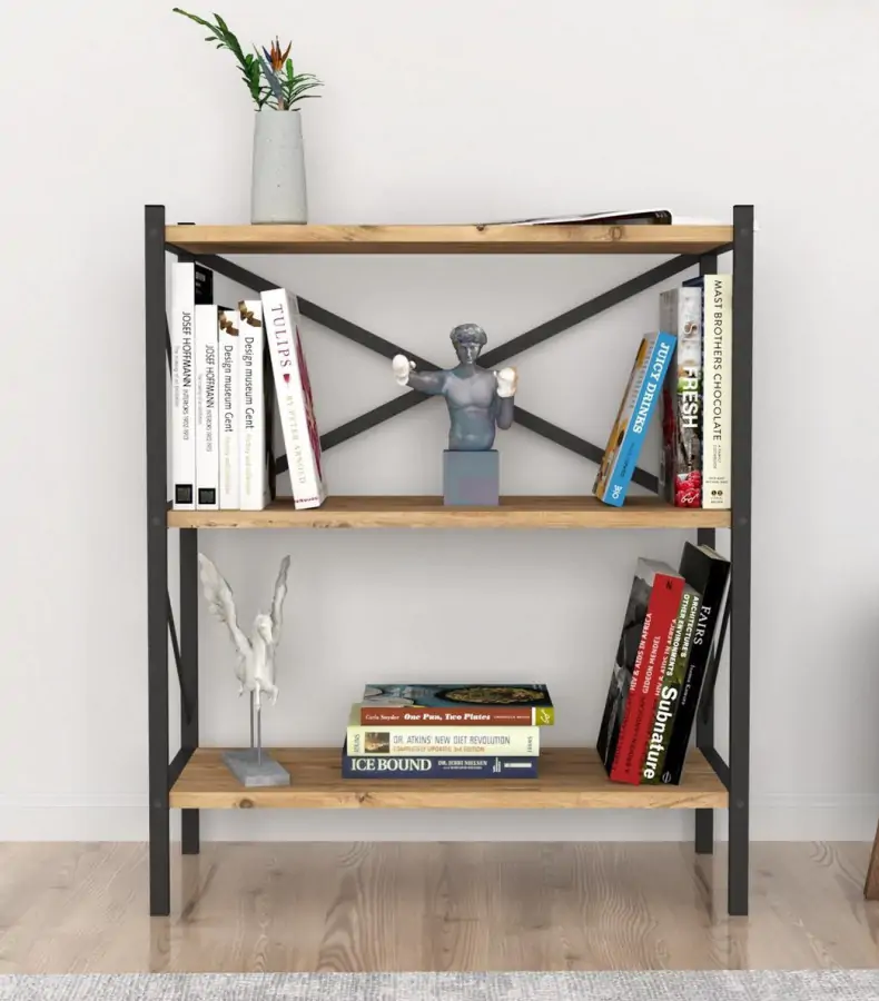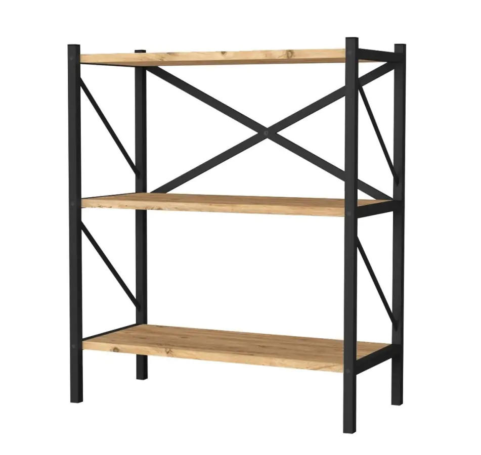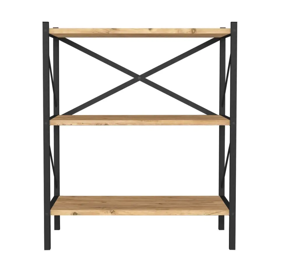 Regál KEPLER se třemi policemi je z kovového rámu v matné černé barvě a police jsou vyrobeny z kvalitní LTD desky v barvě borovice. Dodáváme v demontovaném stavu.