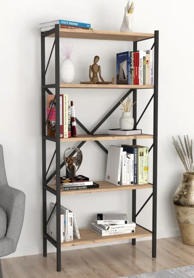 Regál s pěti policemi KEPLER je z kovového rámu v matné černé barvě a police jsou vyrobeny z kvalitní LTD desky v barvě borovice.