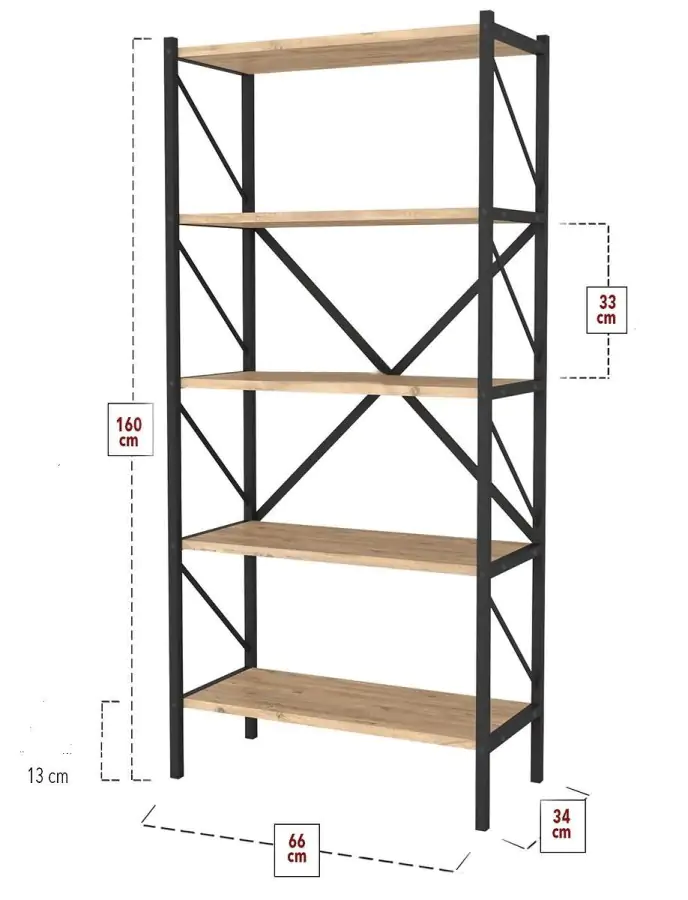 Regál s pěti policemi KEPLER je z kovového rámu v matné černé barvě a police jsou vyrobeny z kvalitní LTD desky v barvě borovice. Dodáváme v demontovaném stavu.