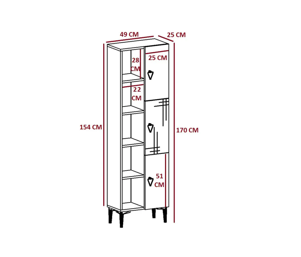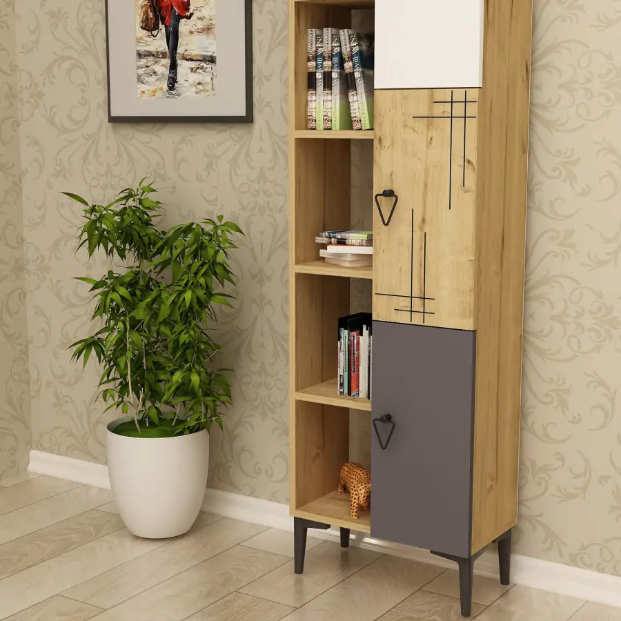 Knihovna je dokonalým spojením funkčnosti a moderního designu. Je ideální pro obývací pokoj, kde nabídne dostatek úložného prostoru díky třem plným dvířkům a čtyřem policím. Její kombinace barev a čisté linie dodají vašemu interiéru elegantní a moderní vzhled.